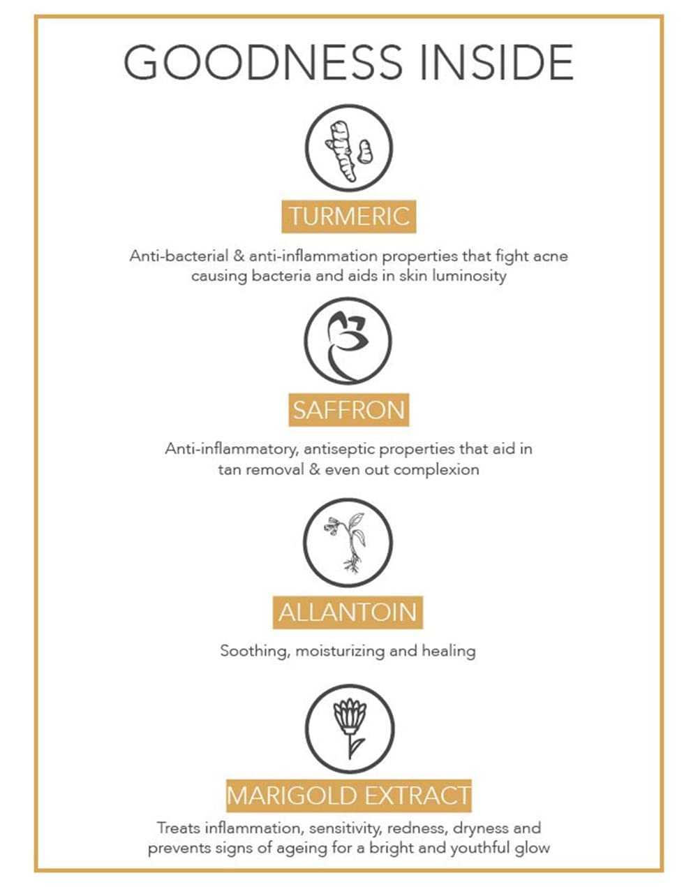 • Turmeric Extract calms hethe skin and lightens pigmentation