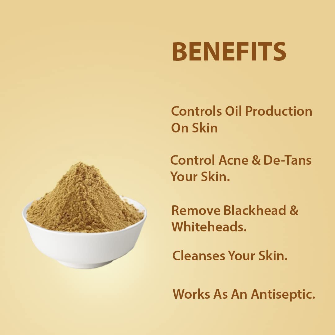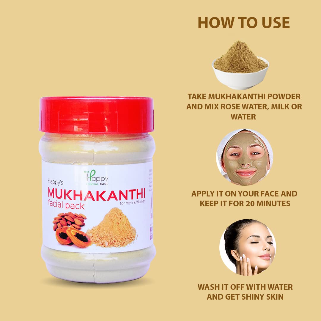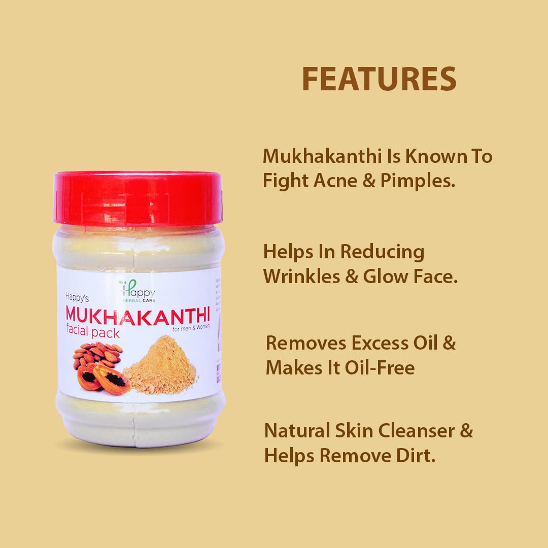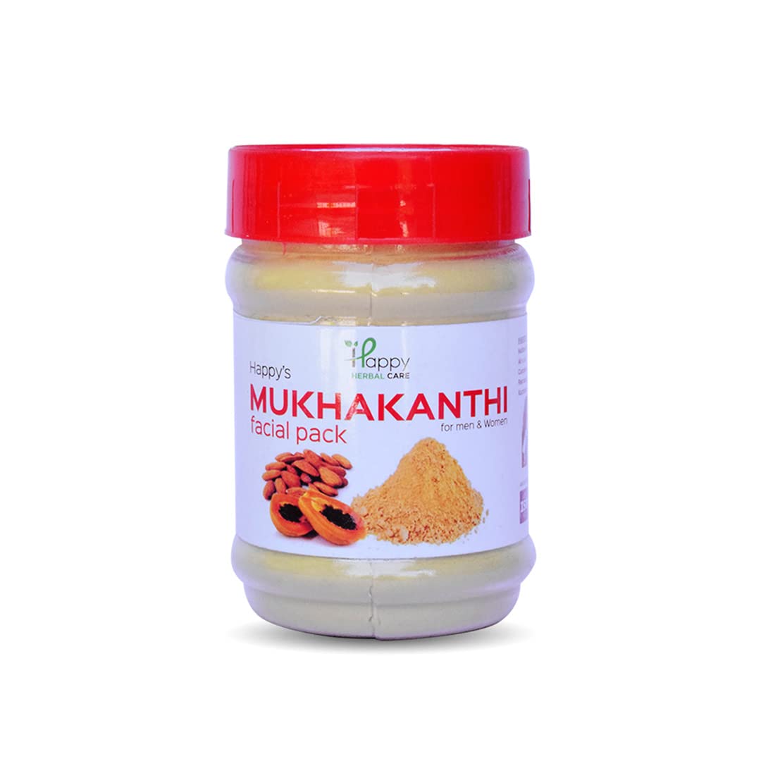 MukhaKanthi (beauty of face) Herbal facial pack is prepared using MultaaniMitti the special clayey soil from Rajasthan almonds (badam) Red sandal (Raktachandan) and Curcuma aromatic (KasturiManjal). MulttaniMitti has the special ability to remove acne and gives glowness to the face.A It removes the dead cells and improves circulation to the skin. It also removes the excess oil from the face. Those who have dry skin should do the facial using milk those who have oily skin in tomato or lemon juice and those who have normal skin in boiled and cooled water/either of sandal lemon lavender jasmine rose water.Mughakandhi Facial Pack has had a number of uses over the years including cosmetics and skin care. It can be found in skin care products such as facial clays and used to fight wrinkles and treat acne. It is known for its ability to absorb oil and other impurities which can make it an effective skin cleanser for people with oily skin or clogged pores.A Its also said to improve skin tone and complexion and soften the skin. It is also believed to have a skin-lightening effect which makes it a popular ingredient in creams that are marketed to the appearance of dark spots.