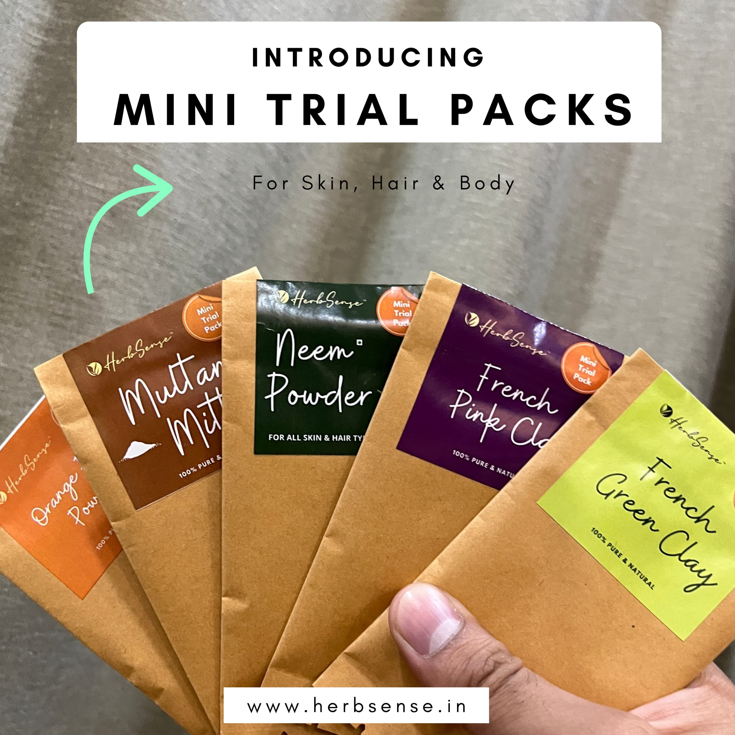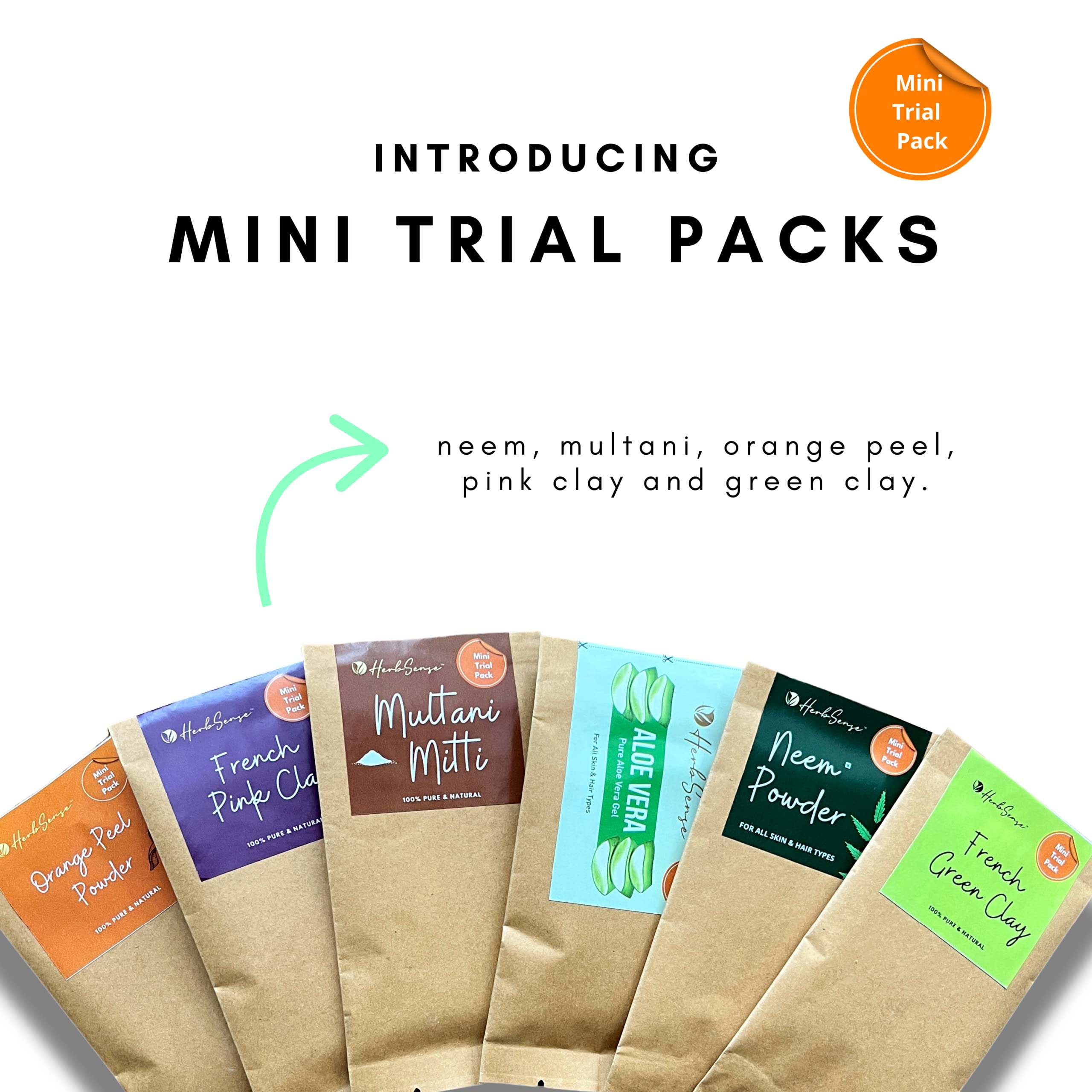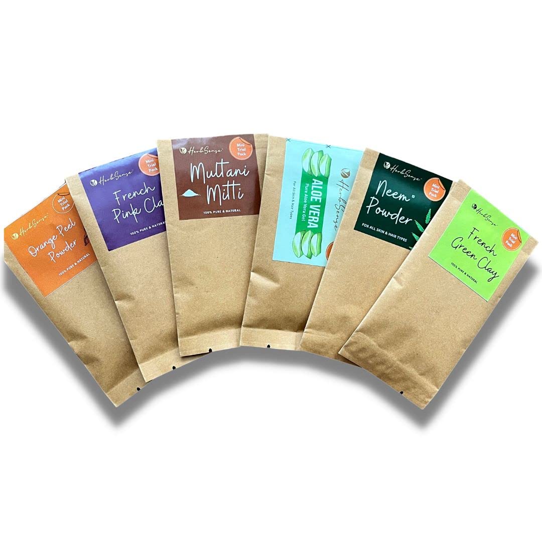HerbSense Skin & Hair Care Mini Trial Combo Pack of 6 -Pure Aloe Vera Gel Neem Powder Multani Mitti Orange Peel Powder French Pink Clay & French Green Clay. DIY Trial Kit for Face Pack Hair Mask Soap making etc.