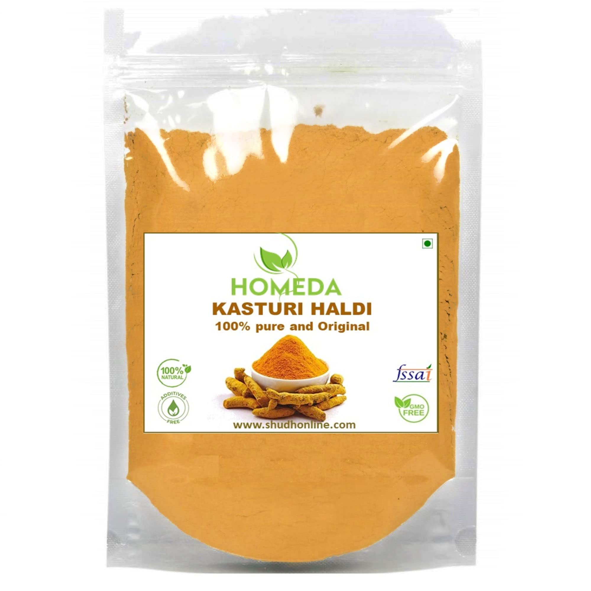 Homeda KASTURI HALDI POWDER FOR FACE BEAUTY is an important ingredient in any Ayurvedic skincare product. The powder is naturally obtained from wild turmeric that is dried and powdered to be used for external application on the skin. It is a natural antiseptic that is highly beneficial. WILD TURMERIC POWDER FOR SKIN WHITENING has been traditionally used to heal and calm the skin. It is also known as Wild Turmeric Manjal Curcuma aromatica Pasupu Arashina Hardhar Halud Pitras Haledi Halad Haladi Haldil Haldar Manjal Lader Amba Haldar Kasturi Manjal Adavipasupu. Shudh Online products are selectively sourced with great emphasis on purity and authenticity and are 100% natural ayurvedic products. We don't add any preservatives or additives in the product and using our product will get you closure to nature.