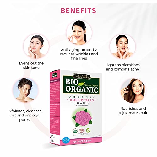 INDUS VALLEY Bio Organic 100% Pure and Organic Rose Petals Powder | Rosa indica- for Skin Care, enriched with Vitamin A and C and regenerate skin cells, glowing and healthy - (100g*3-300g))