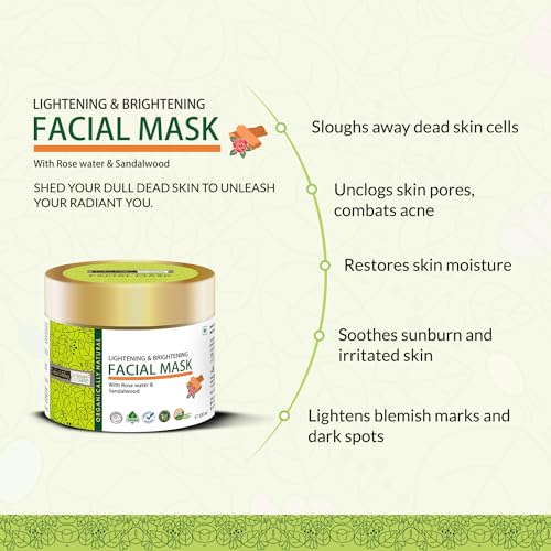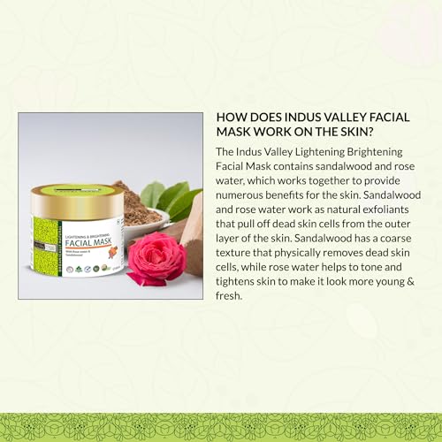Indus Valley Lightening And Brightening Face Mask with Rose & Sandalwood is enriched with the essential goodness of Mountain Rosewater and Mysore Sandalwood that is specifically designed to cleanse the skin without any harmful after effects. The combinational effect of Rose water and sandalwood helps remove all dirt and help soften the skin in a perfect manner. It also works as the ideal Face mask for pollution that helps combat the harmful effects of skin damaging radicals like pollutants UV rays etc. This Natural Face mask for clear skin happens to be perfect for soothing and firming purposes that in addition helps combat skin-ageing in a completely herbal manner. This Fresh aroma face mask helps diminish Scars blemishes and any kind of marks and also combats acne pimples and breakouts that renders it the perfect Face mask for pimples. It isn't without reasons that it is rendered as the Best natural face mask for it consists of certified natural components like herbs plant extracts and other essential oils. The essential goodness of the herbal constituents helps to render it as an excellent cream with multiple benefits and the other components include that of Aniseed oil Wheat Germ Oil Seasame Oil Grapefruit extract Rose oil etc. Directions For Use: Apply this Face mask for sensitive skin on clean and moist skin avoiding the areas adjoining the eyes. Leave it for 10-15 minutes before rinsing off with water. To yield the best results that this amazing face pack offers in terms of complete Face treatment repeat it twice a week. This product is mild and gentle enough for daily use as well.