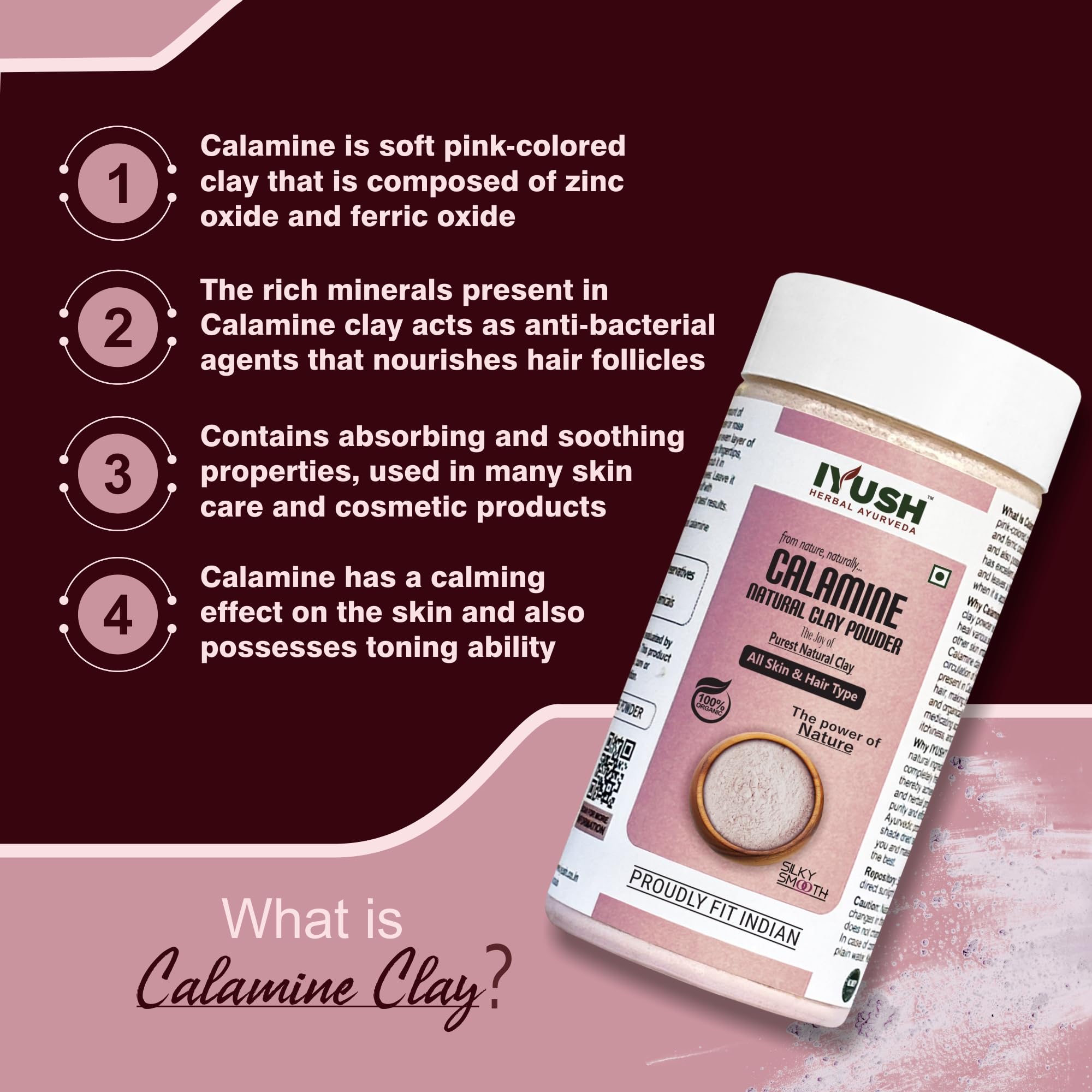 Calamine is soft pink-colored clay that is composed of zinc oxide and ferric oxide which has a calming and toning effect on the skin. It acts as an absorbent that effectively absorbs dirt and impurities from the skin and hair and is naturally rich in essential vitamins and minerals that deeply nourish the skin and hair. Free from additives preservatives adulterations artificial colors or synthetic ingredients.