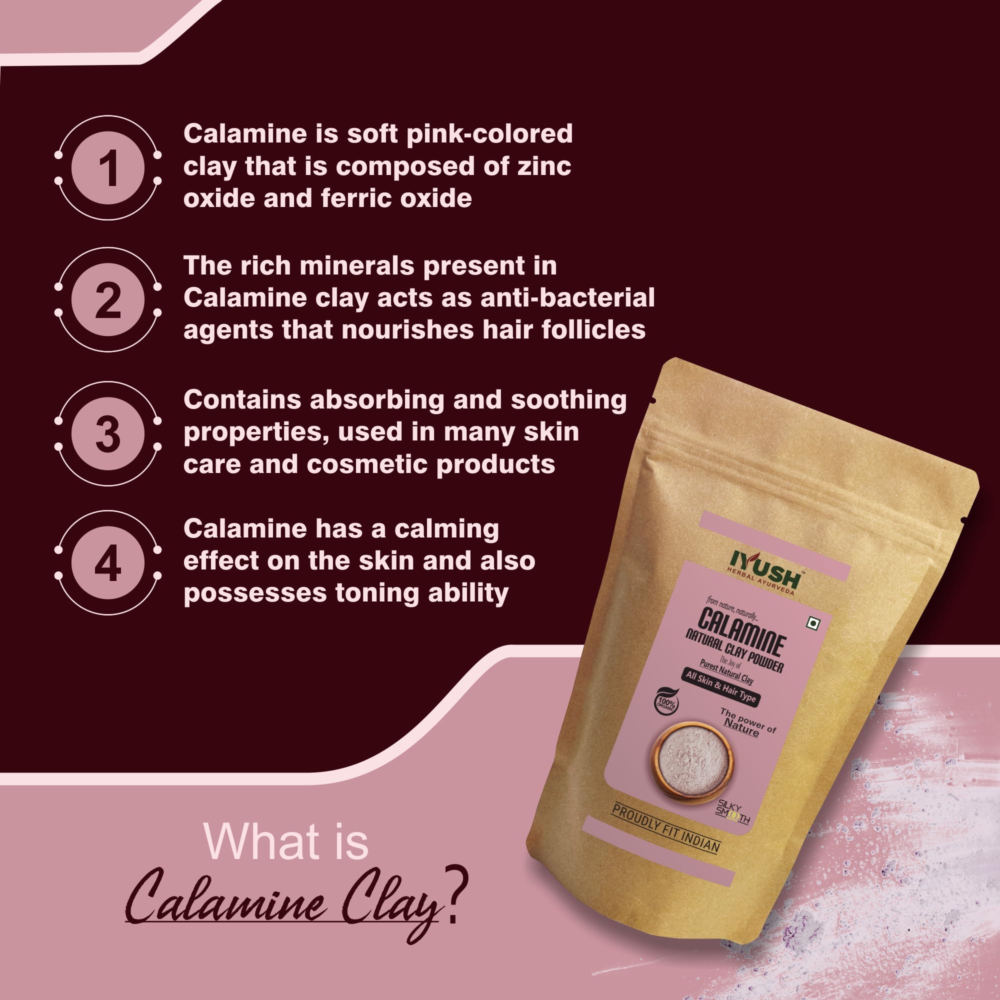 Calamine is soft pink-colored clay that is composed of zinc oxide and ferric oxide which has a calming and toning effect on the skin. It acts as an absorbent that effectively absorbs dirt and impurities from the skin and hair and is naturally rich in essential vitamins and minerals that deeply nourish the skin and hair. Free from additives preservatives adulterations artificial colors or synthetic ingredients.
