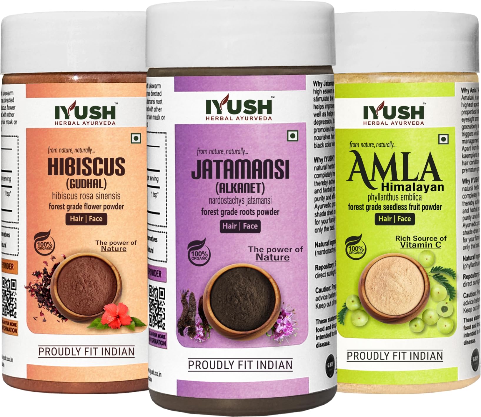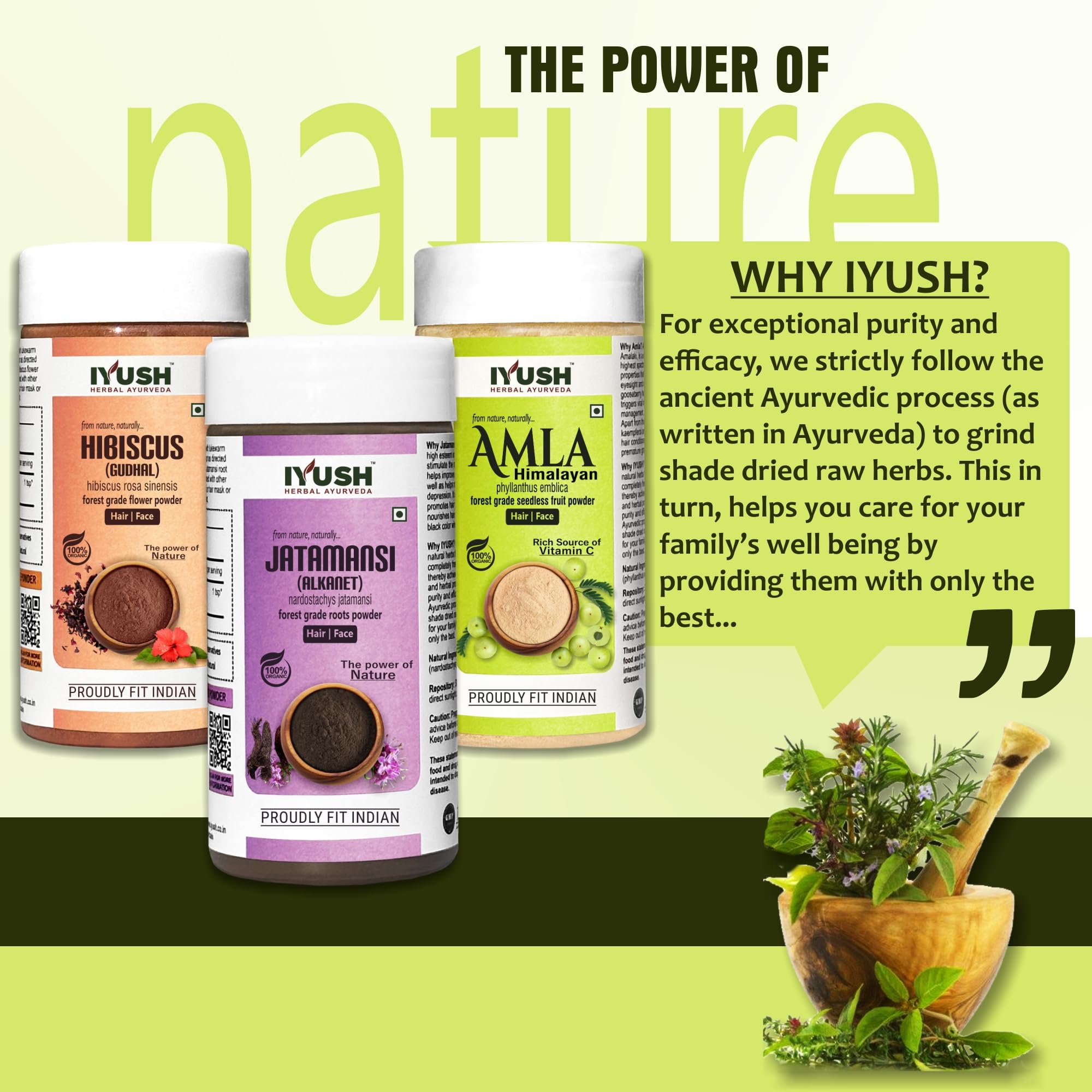 IYUSH Herbal Ayurveda Jatamansi Amla Hibiscus Powder for Hair Growth 300gm | Amla Powder Hibiscus Powder and Jatamansi Powder | Hair Volume Powder | Skin Care & Hair Care | (100gm each)