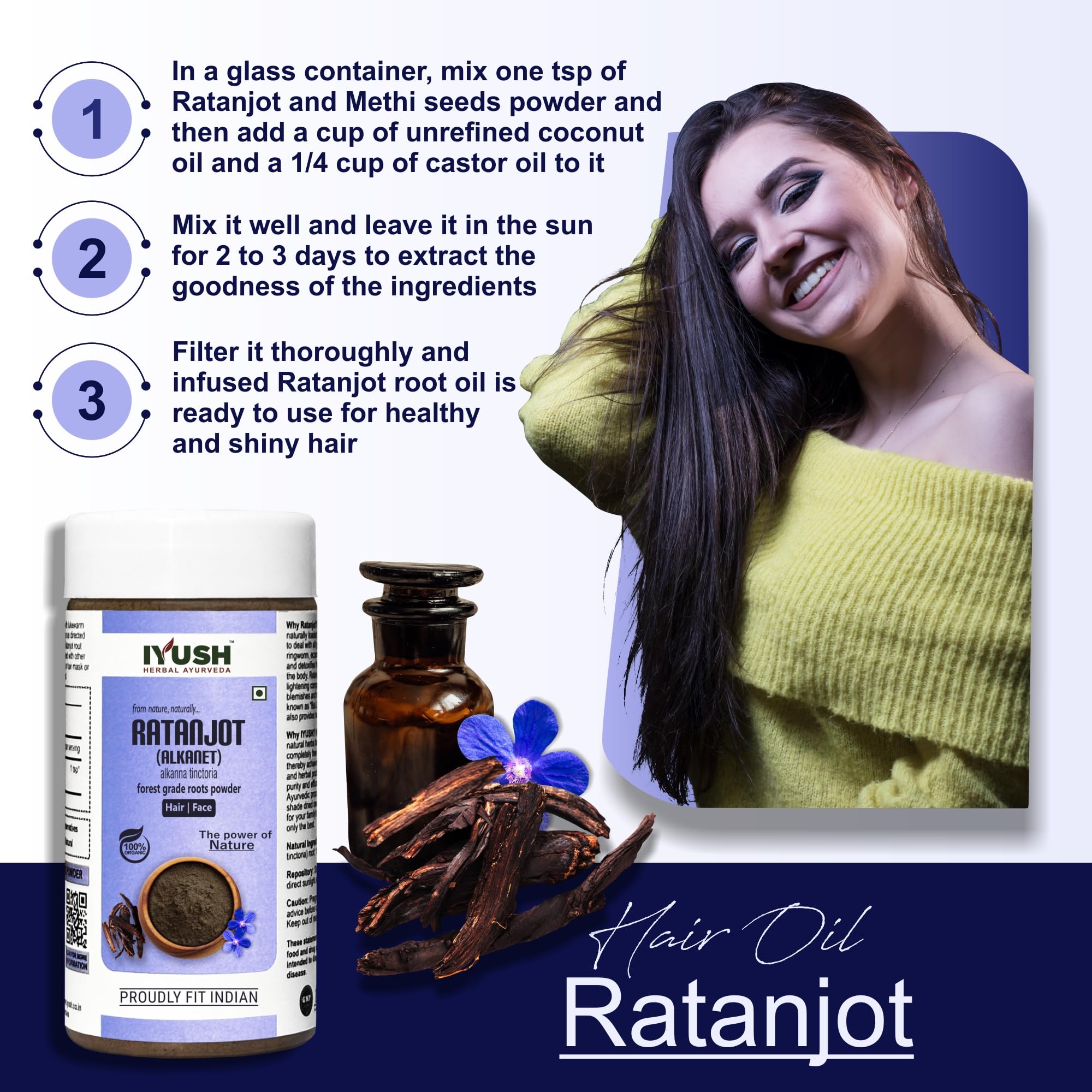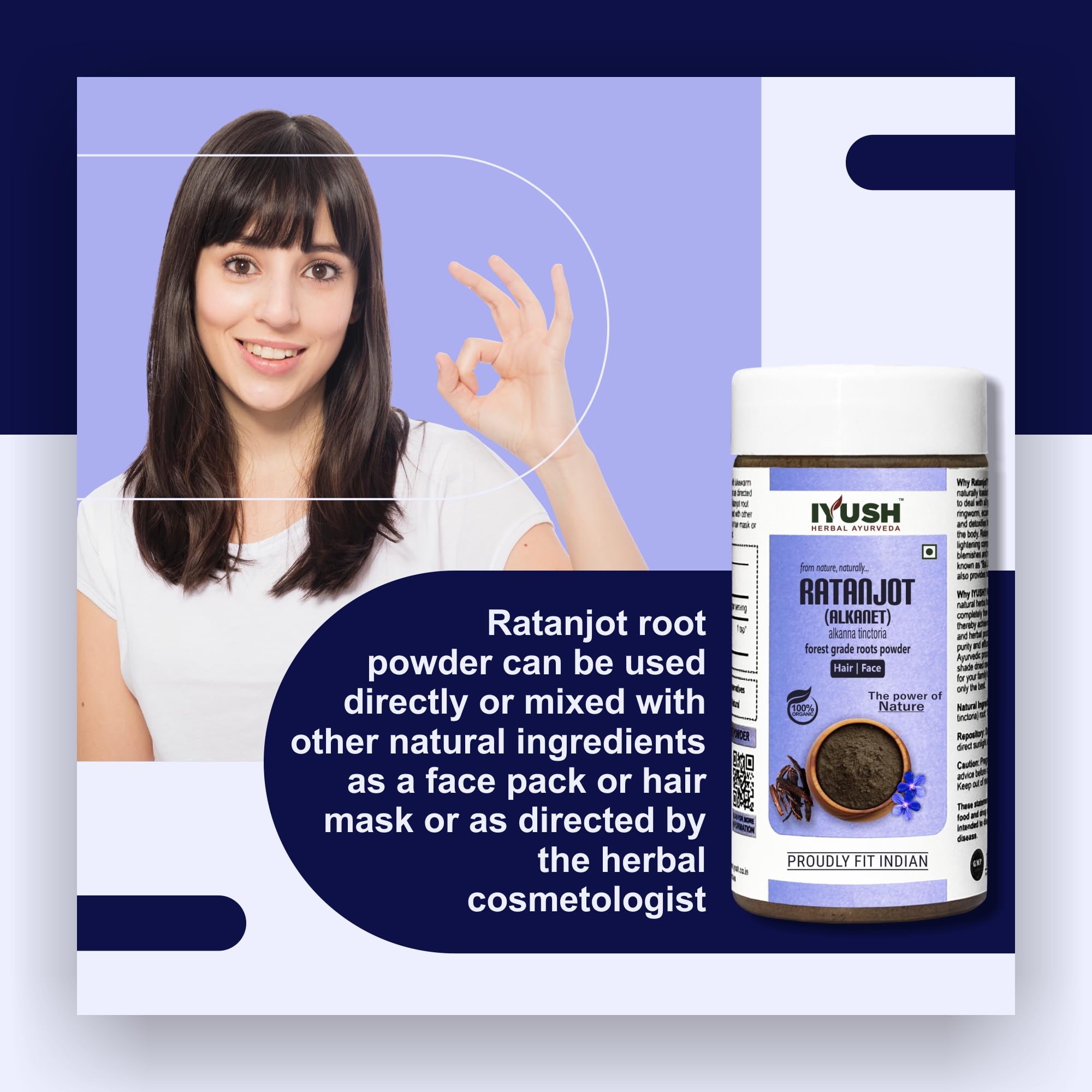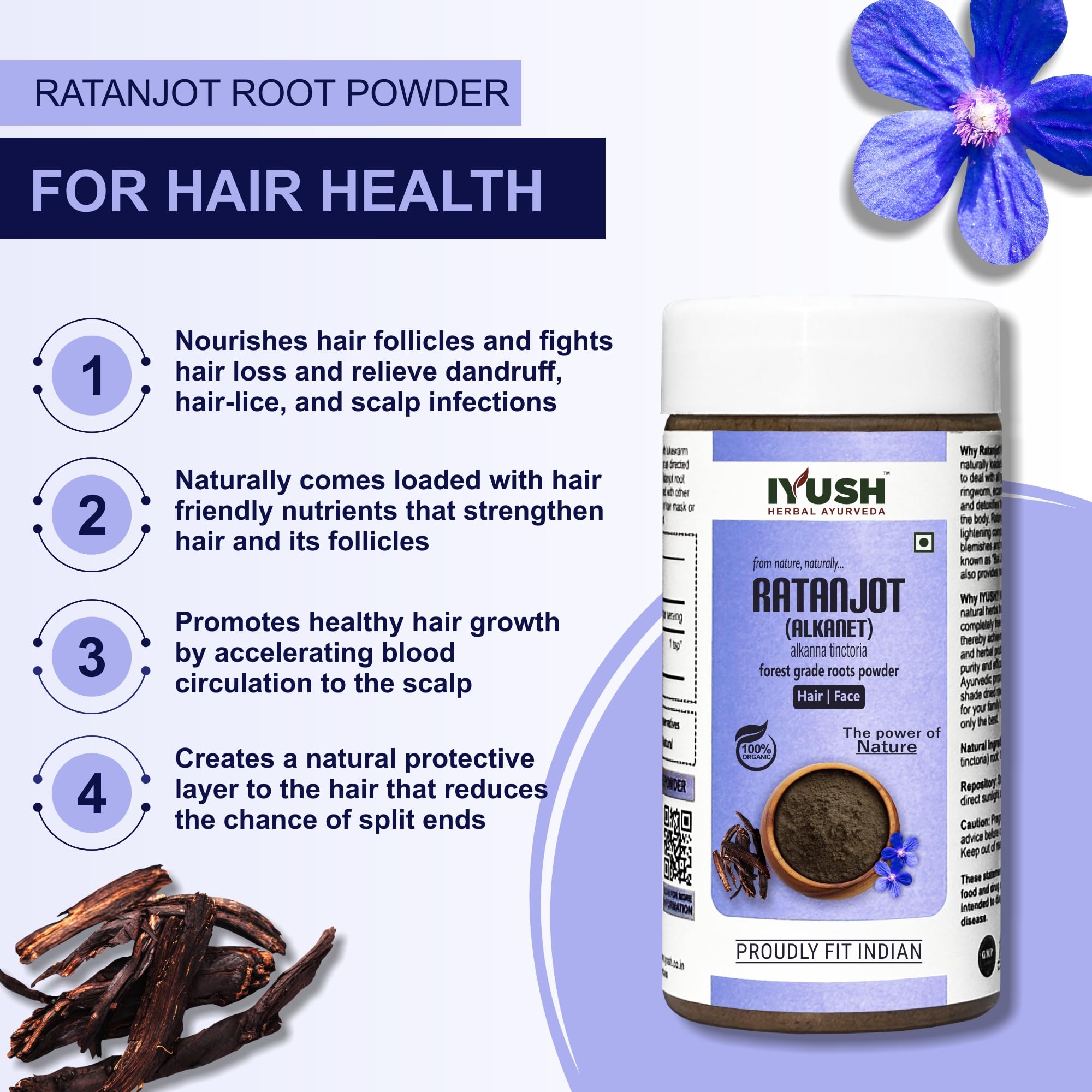 • FOR HAIR : Ratanjot root supports healthy hair growth and is traditionally used to combat scalp infections and dandruff. Enriched with vitamin-C & natural protein Ratanjot root nourishes hair roots and reduces split ends & dryness.