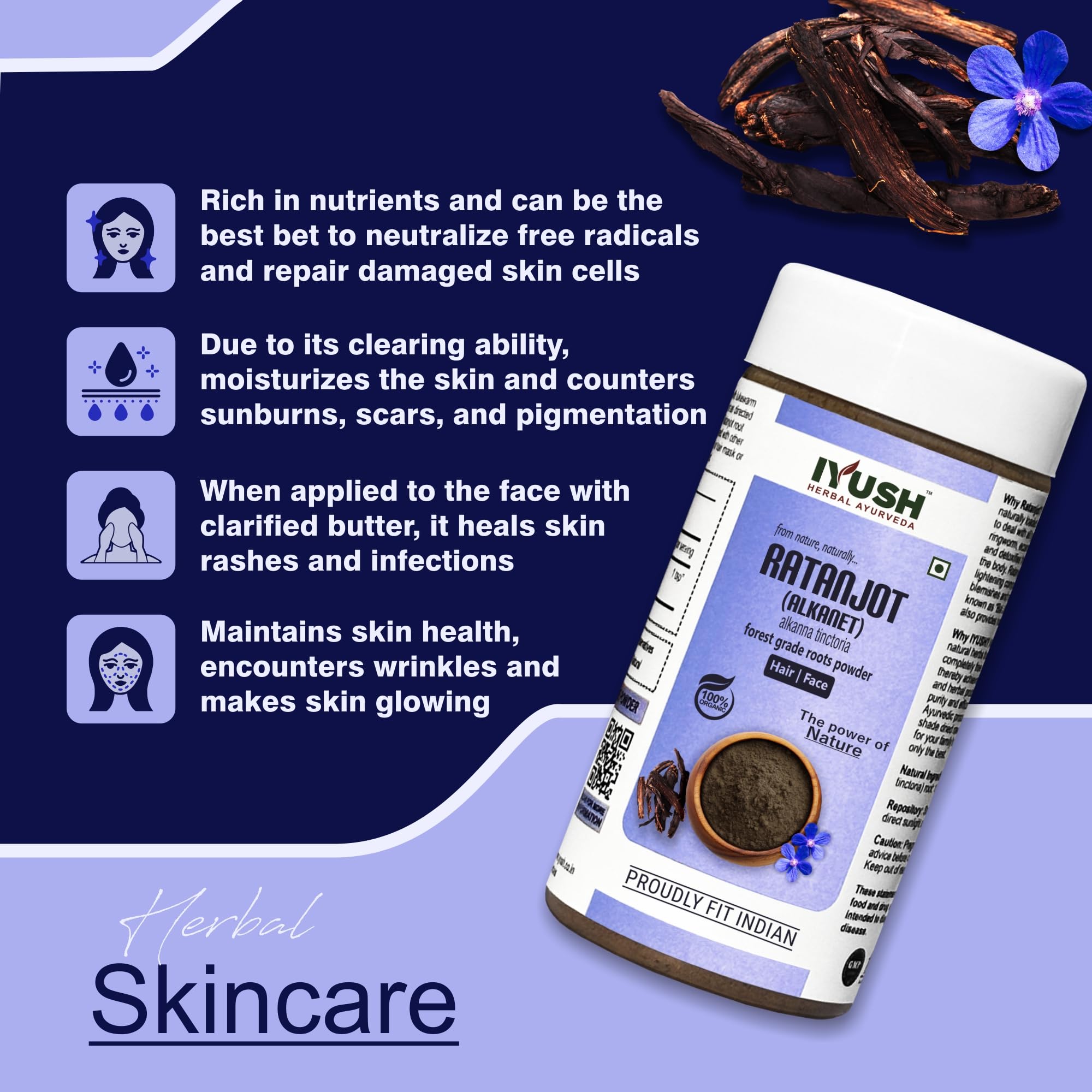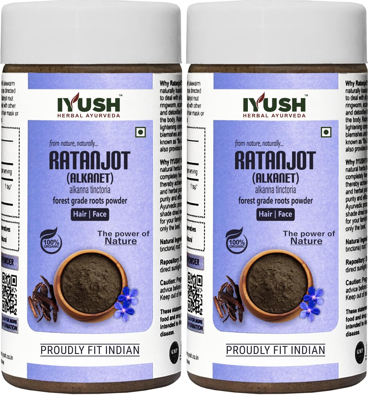 IYUSH Herbal Ayurveda Organic Ratanjot Root (Alkanet Root/Arnebia Nobilis) Powder For Skin & Scalp Acts As Natural Coloring Agent - (Pack Of 2) 100gm each bottle