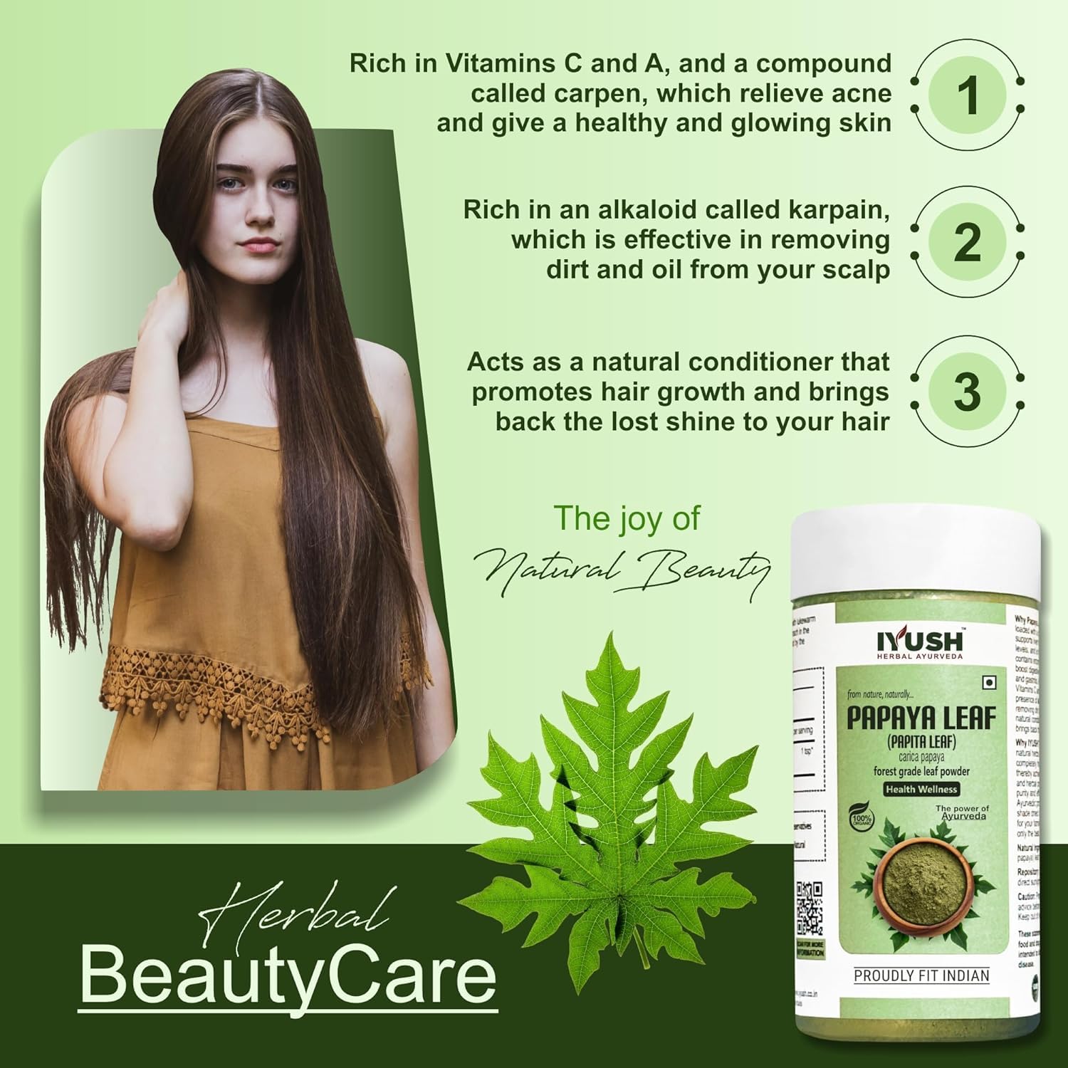 Papaya also known as Carica papaya is a natural herb that has been used in Ayurveda for centuries for numerous health skin and hair benefits. It is an organic natural powder made from shade-dried wild forest grade Papaya leaves that contain the highest active nutrients grown naturally without any harmful chemicals or pesticides or fertilizers.