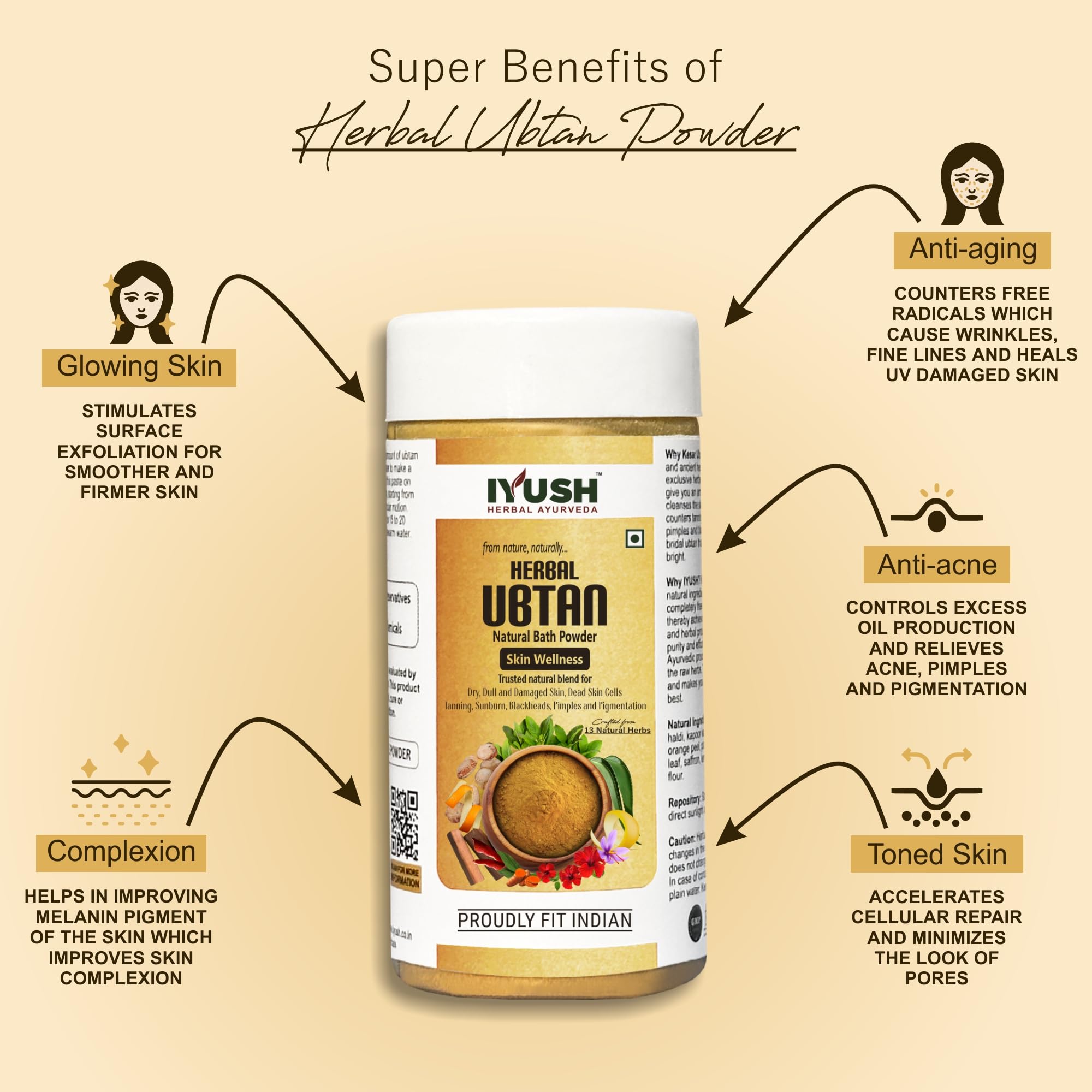 • Traditional Blend of 13 Potent Herbs for Complete Skin Nourishment: Ubtan powder is an ancient and traditional blend of 13 potent natural herbs like Sandalwood Kasturi haldi Hibiscus Orange Pomegranate and Lemon peel pure Saffron Tulsi Aloevera Neem etc.