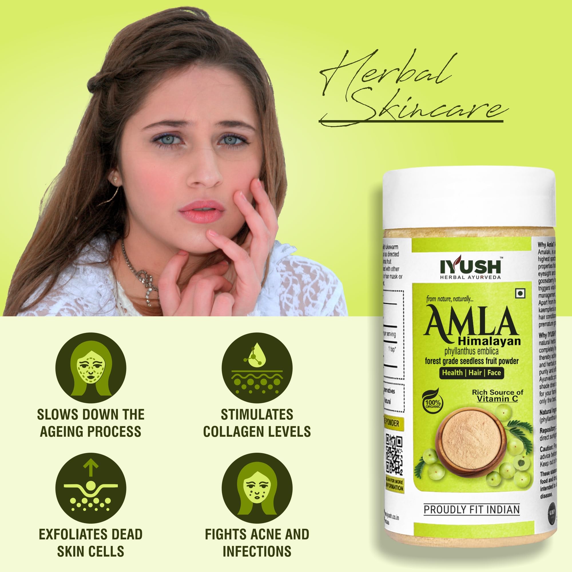 Organic Amla powder for skin: Natural Amla powder contains a natural blood-purifying properties that relieves pimples and pigmentation as well as it exfoliates dead skin cells and makes the skin tight and supple by increasing the production of collagen le
