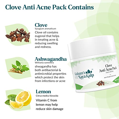 • Kulsum's Kaya Kalp Herbals Clove Anti Acne Pack is a blend of key ayurvedic ingredients like clove oil lemon and ashwagandha extract to help heal the skin and provide a natural glow.