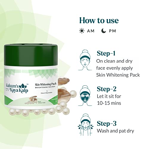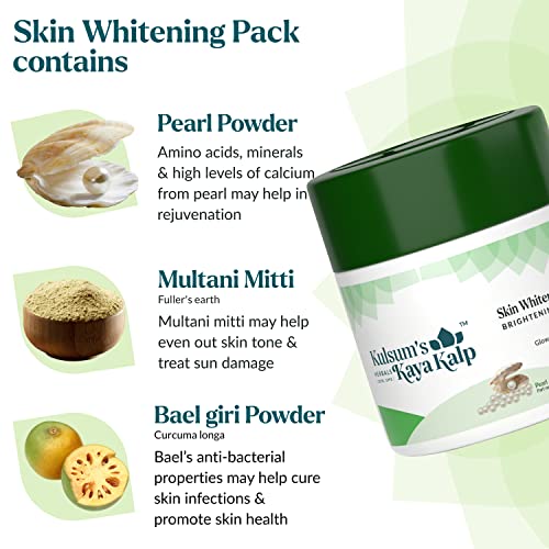 Get pearl-like sheen with Kulsum's Kaya Kalp Herbals Skin Whitening Pack. It is composed of ayurvedic ingredients - baelgiri powder multani mitti pearl powder and aloe vera to provide a radiant glow to the skin. These skin-nourishing ingredients have several anti-bacterial and anti-inflammatory properties. This all-natural ayurveda and eco-friendly face pack contains high amounts of amino acids antioxidants vitamins and minerals. Pearl powder helps collagen regenerate itself and also protects from oxidative damage caused by free radicals. Hence it provides a radiant glow to the skin. Multani mitti helps enhance skin elasticity. Aloe vera helps hydrate the skin and makes it soft. Bael giri helps reduce inflammation and redness. This face pack goes deep into the skin & promotes cellular repair hydration & boosts antioxidant activity in the skin while maintaining overall skin health. This mask leaves the skin glowing & bright.