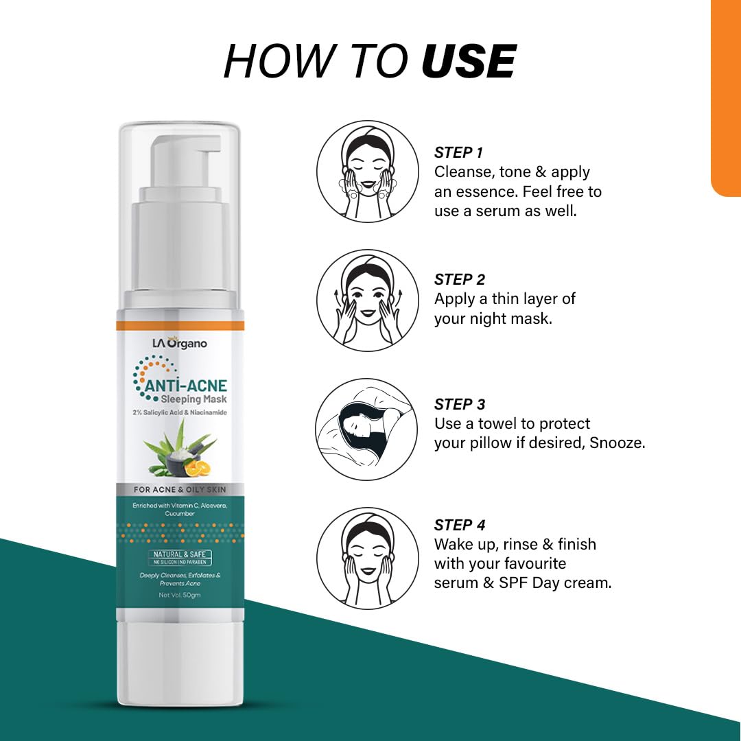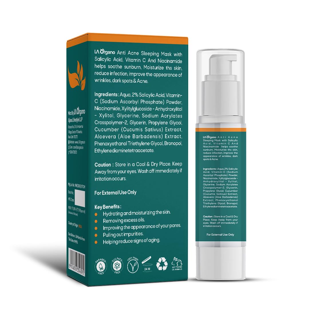 LA Organo Anti Acne Sleeping Mask with 2% Salicylic Acid Niacinamide & Vitamin C helps soothe sunburn moisturize the skin reduce infection improve the appearance of wrinkles dark spots & acne.