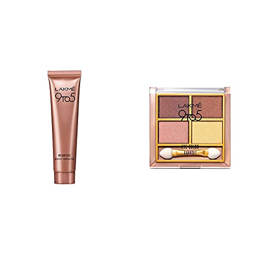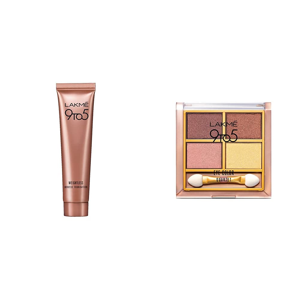Lakme 9 to 5 Weightless Mousse Foundation Beige Vanilla 6gLakme 9 to 5 weightless mousse foundation is your answer to a workings women's barrier to using foundation. It is a lightweight foundation meant for everyday use. It is so lightweight that you won't even feel you are wearing foundation. It not only blends in effortlessly but gives a matte finish that lasts through the day. It is available in 2 shades in mini pack and is extremely convenient to carry. Foundation with new formula that feels soft and incredibly weightless and is perfect for everyday office use. It blends effortlessly onto skin to conceal imperfections with a matte finish that stays through the day. With complete coverage it's a foundation so weightless you may forget you are wearing any foundation matte finish in a weightless mousse texture pocket sized tube that is easy to carry around complete coverage lightweight and long wear available in 2 office-wear shades â rose ivory beige vanilla. It is suitable for all skin types and is dermatologically tested. How to apply: just take a small amount of product with the index finger and start applying it to the skin with your fingertips. Usually you can just apply the mousse in four places: the forehead nose chin and cheekbones. Blend into your skin starting from the centre of the skin outwards taking care to cover your face including your neck. Maximum Shelf Life: 24 MonthsLakme 9 to 5 Eye Color Quartet Eye Shadow Desert Rose 7gYour perfect office eye stylist is here! The versatile colors in the Lakme 9 To 5Eye Quartet and the high-intensity powders give your eyes a defined finish. The radiant color and shimmer particles shape and highlight your eyes to give you that professional edge. Use the lighter shades for office wear and darker shades for your night look. The special applicator makes it very easy to do your own eyes and you can mix the shades to create new looks everyday! Buy the Lakme 9 To 5Eye Quartet right away! Lakme 9 To 5Eye Quartet has a versatile palette of eye shadows developed specially for work. Lakme 9 To 5Eye Quartet is packed with key features like: High intensity powders with delicate hints of shimmer Smooth and silken texture 4 eye shadows in 1 palette Comes with a sponge applicator Available in 4 palettes. How to apply: Using the sponge applicator sweep the shadow from the palette and then apply it on the crease of your eyelid. Pro-Tip: Once the tip gets a little blunt it's great for experimenting with bold smokey looks. For finer strokes sharpen with Lakme Dual Sharpener. Lakme 9 To 5Eye Quartet goes well with 9to5 weightless mousse foundation as base 9to5 matte lipsticks and Eyeconic kajal for an enhanced look.