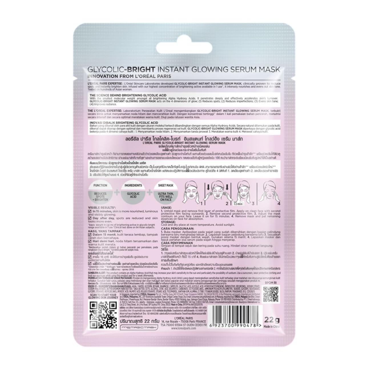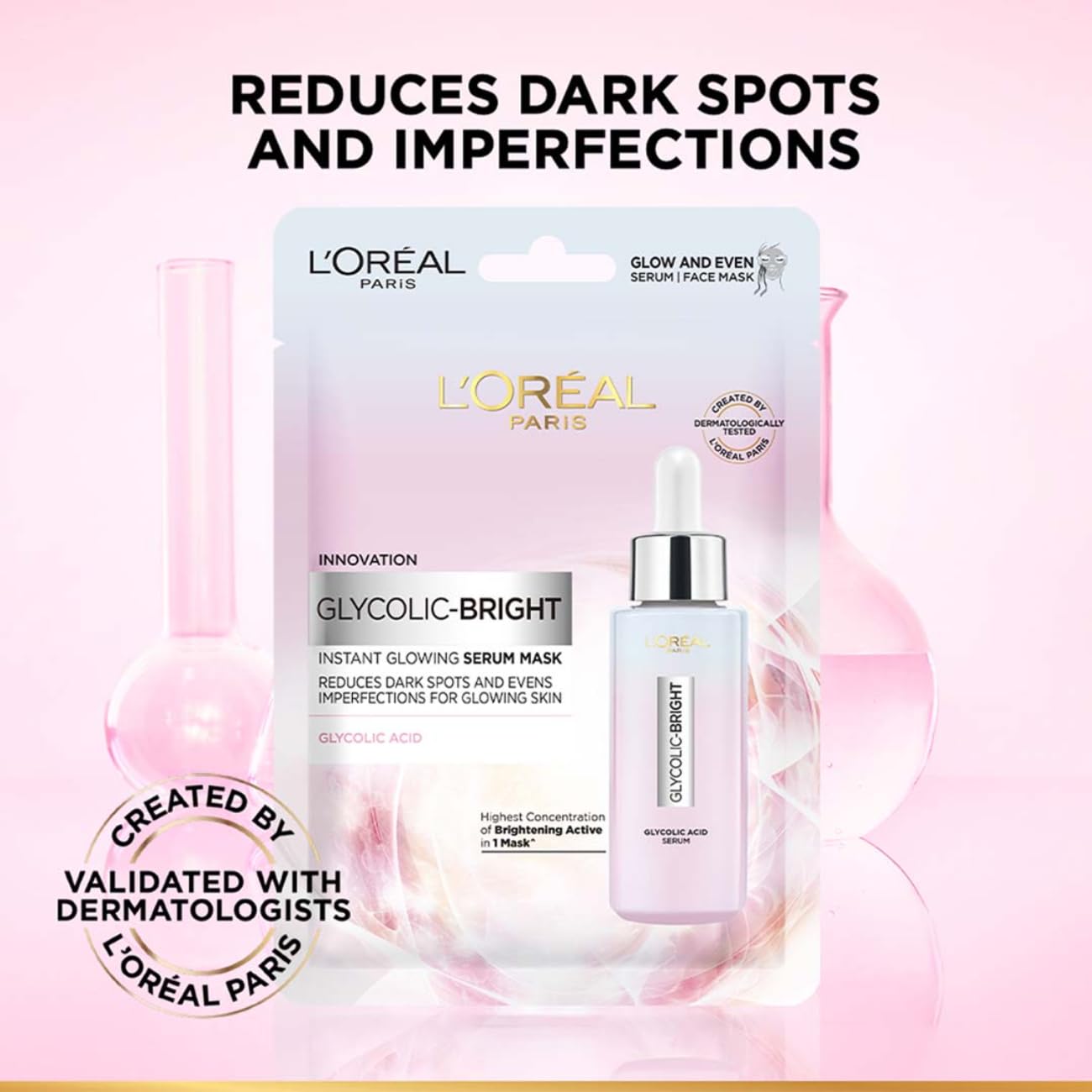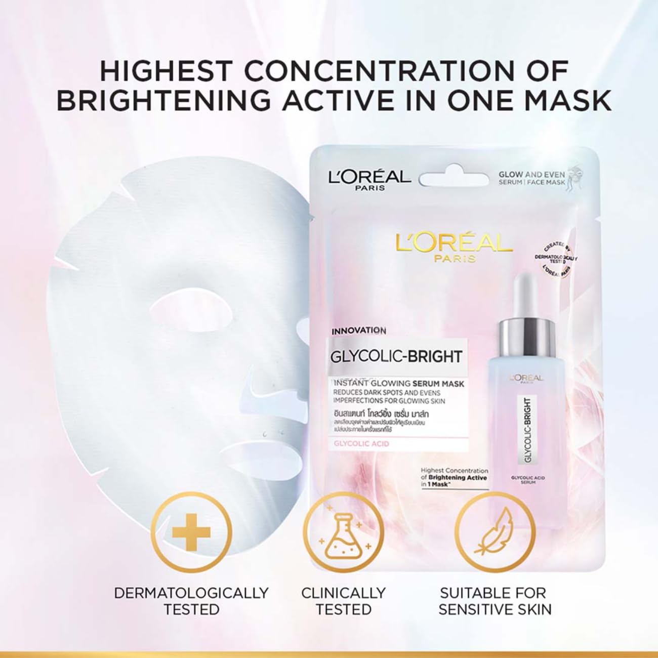 Pamper your skin with the love and care it needs with the all-new L'Oreal face mask for glowing skin. Enriched with glycolic acid the L'Oreal sheet mask reduces dark spots and evens imperfections for glowing skin while giving it the boost of hydration it needs. Glycolic acid has the smallest molecular weight amongst all brightening AHAs and penetrates deep within the epidermis layer of the skin to help stimulate cellular activity. Using this sheet mask infused with glycolic acid for skin will help to remove years of dark spots in just a few weeks which makes it one of the best face masks for glowing skin. It is dermatologically tested gentle yet effective and suitable for all skin types including people with sensitive and acne-prone skin. So what are you waiting for? Add the L'Oreal glycolic acid sheet mask into your regular skincare routine right away to achieve nourished luminous radiant and healthy skin with ease.