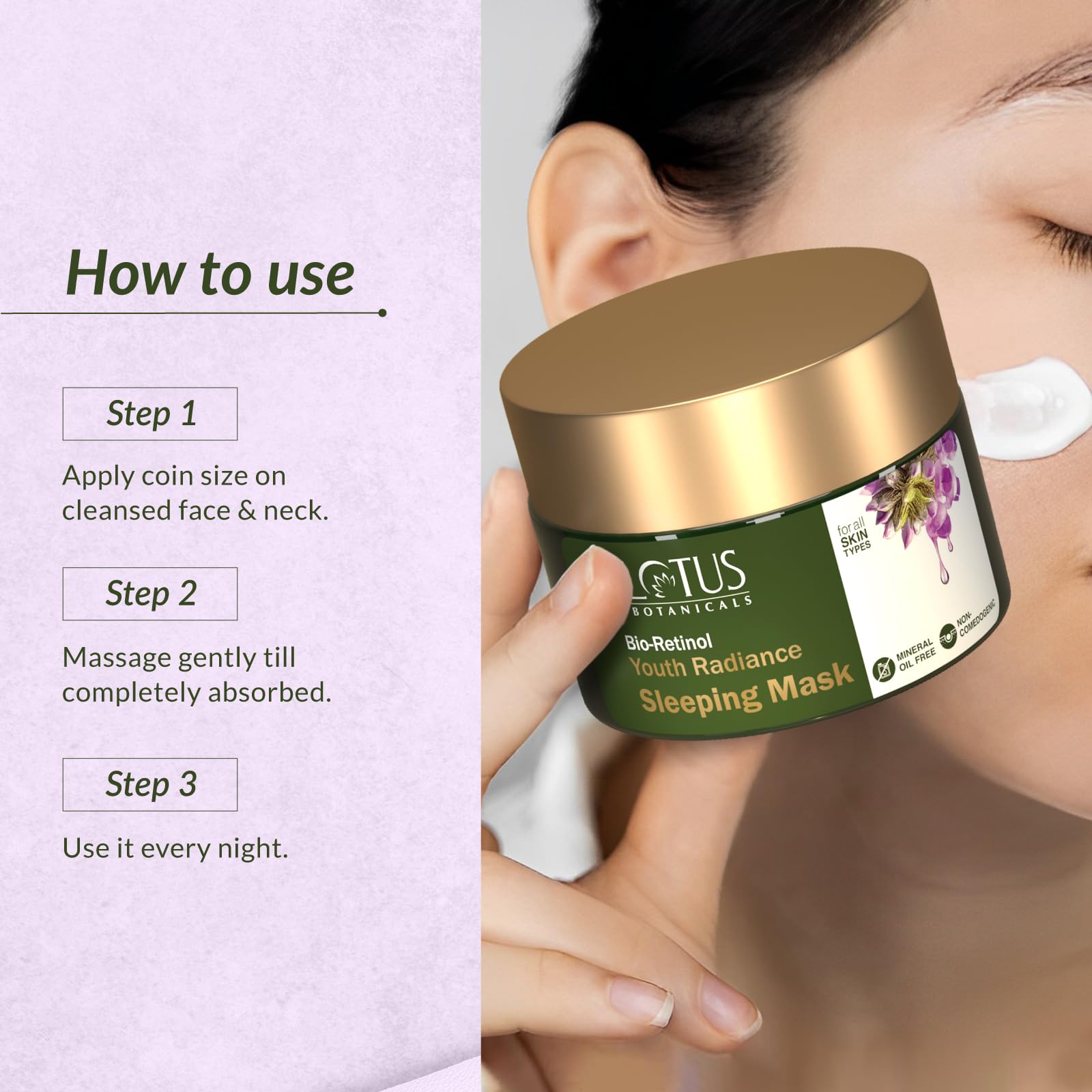 This sleeping mask is very fast absorbing and nourishes my skin overnight it also works on fine lines and wrinkles because the formula goes in to the skin and locks the moisture. I m searching this type of formula from long time