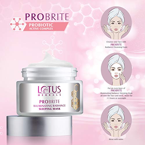 About probiotics: - our body is full of bacteria good and bad. Probiotics are “good “ and ”helpful” bacteria because they have various health benefits most commonly known to keep gut healthy when consumed via yogurt etc. Why probiotics for skin When applied topically probiotics skincare sits onthe skin'ssurface and creates “interference" against skin problems. This "shield" helps to protectthe skinagainst dark spots dull skin patches environmental aggressors uva/uvb rays. Help the skin to remain in a balanced state maintain a skin type which is not too dry and not to oily nurtures the skin flora giving it a natural flawless glow. Why lotus herbals probrite It is India's first ever probiotic skincare range which was developed after extensive research and development aiming to combat skin concerns of a modern day women. The products are formulated with the science of probiotics ensuring that your skin receives the right balance of nutrients and stays protected against bad bacteria. So get skin smart and make your skin glow like never before. This revolutionary product is enriched with probiotic active complex which contains two highly potent natural ingredients: lactococcus ferment lysate: helps skin’s good bacteria which boosts skin brightening and inhibits melanin production rare sakura extracts: dark spots and discoloration are visibly diminished revealing a brighter and even complexion. Probrite illuminating radiance sleeping mask - pollution environmental aggressors stress and lifestyle stresses out the skin. A unique ground-breaking skin therapy probrite illuminating radiance sleeping mask with ‘probiotic active to complex ’ is the perfect solution. It works overnight to detoxify the skin and restores skin’s nutrition overnight. Its intensive hydration process gives your skin a beautiful dewy glow in the morning.