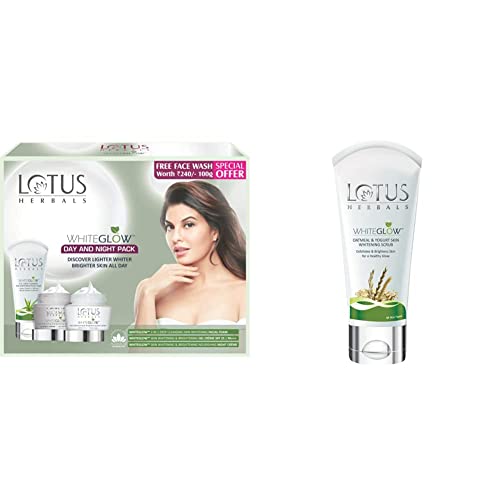 Lotus Herbals White Glow Day And Night Pack with free Face wash220gmThe WhiteGlow Day and Night Pack is a perfect start to your day right from cleansing to moisturisation and skin whitening ending with soothing night nourishment. WhiteGlow 3 in 1 Deep Cleansing Facial Foam -( Net Qty -100G ) is specially curated to cleanse the skin deeply. It is a hydrating super gentle cleanser that gets right to work washing away dirt makeup and excess oil. WhiteGlow Skin Brightening Gel Creame -( Net Qty -60G ) is the best skin whitening cream that delightfully blends into the skin leaving it smooth radiant and hydrated all day long. The SPF 25 provides much-needed sun protection too. WhiteGlow Skin Brightening and Nourishing Night Creme -( Net Qty -60G ) is a perfect leave-in night treat for tired skin as it strengthens the skin barrier promotes cell growth and enhances your glow.Lotus Herbals White Glow Oatmeal And Yogurt Skin Whitening Scrub 100gMake your skin look naturally fair using the Lotus Herbals WhiteGlow Oatmeal and Yogurt Skin Whitening Scrub. It is specially designed to make your skin look clearer and fair. Powerful Natural Ingredients This skin whitening scrub is infused with oatmeal and yogurt enzymes that offer a gentle exfoliating action to remove dead skin cells. In addition these enzymes help lift off dirt impurities oil blackheads and whiteheads from the pores leaving the skin clean clear and spotless. They even out your skin tone while preventing dull skin and discoloration. Keeps your Skin Moisturised Oatmeal also hydrates your skin and locks in the moisture. Yogurt helps prevent the skin from tanning and ageing. This Lotus Herbals skin whitening scrub is suitable for normal dry combination and oil prone skin. It brightens your skin tone and gives a healthy glow. Directions for Use This skin whitening scrub comes in a convenient 100g tube. Squeeze a pea-sized amount of the scrub apply on wet face scrub and wash off with clean water. Get this Lotus Herbals WhiteGlow oatmeal and yogurt skin whitening scrub at Amazon India.