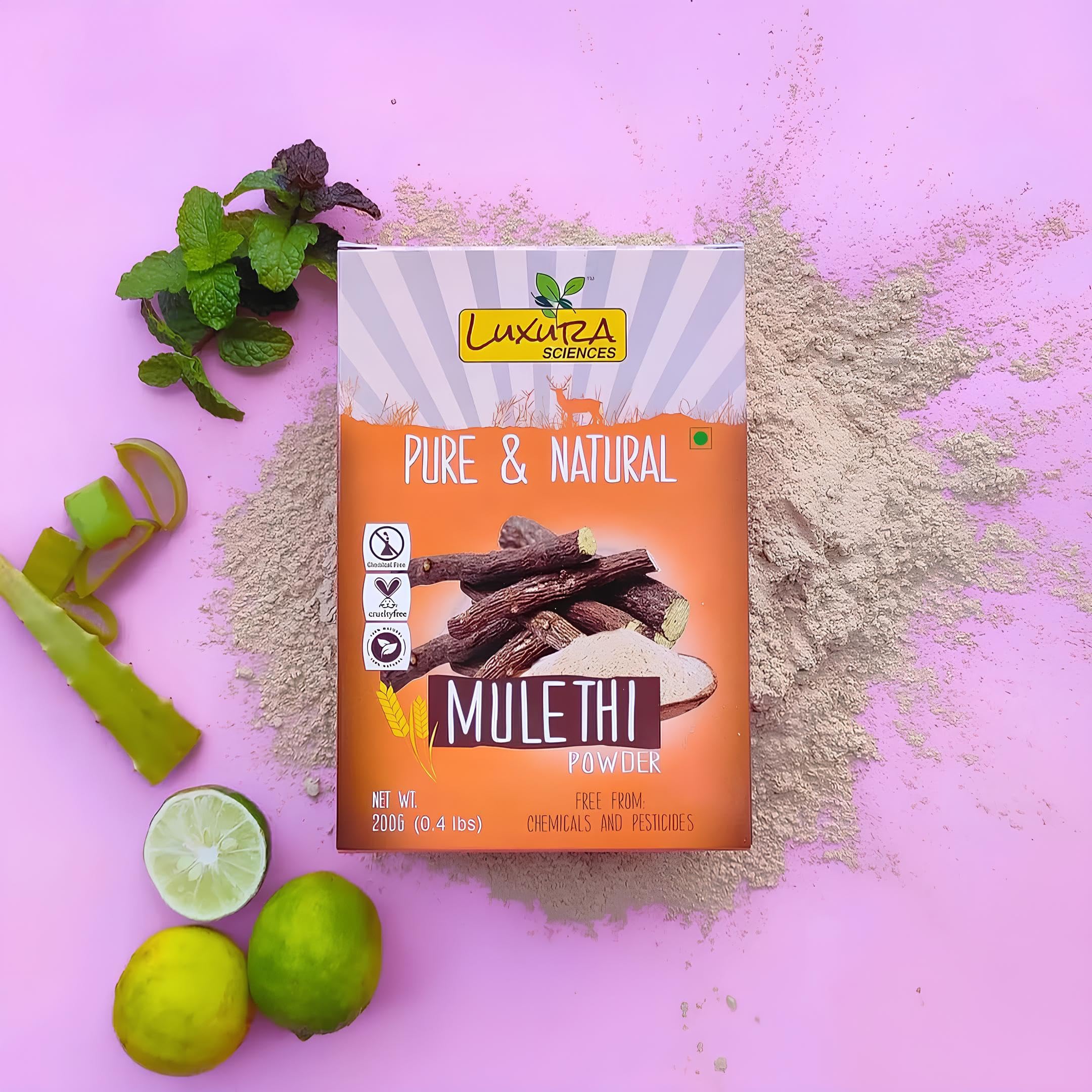 Even Complexion: The skin-brightening properties of mulethi powder help promote an even skin tone minimizing the appearance of blemishes acne scars and discoloration. It evens out pigmentation irregularities giving you smoother and more uniform skin.