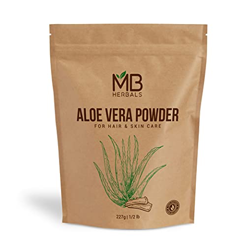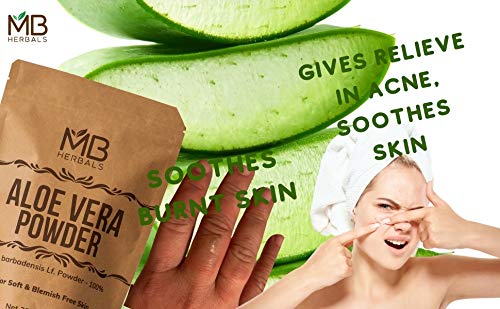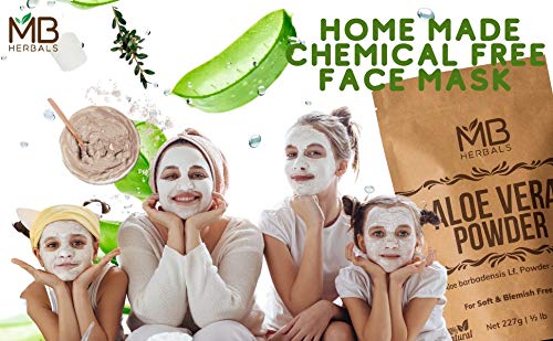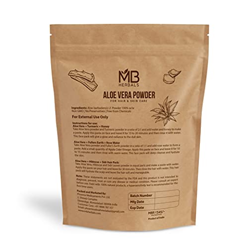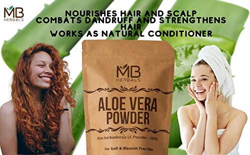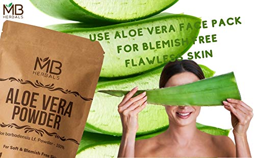 MB Herbals Aloe Vera Powder 227 Gram | Aloe barbadensis Lf. Powder 100% | For Aloe Vera Face Packs Face Masks Hair Packs and Hair MasksPure Aloe Vera Leaf Powder. No Preservatives Parabens Chemicals or External Fragrance. Aloe Vera is an Excellent Natural Moisturizer | Repairs Damaged Skin | Controls Dark Spots Acne & Scar Marks | Provides Nourishment to Skin and Keeps the Skin Hydrated and Healthy. Aloe Vera Contains 75 Active Constituents Beneficial to Skin. Aloe Vera is Rich in Vitamins Enzymes Minerals Lignin Saponins & Amino Acids | Aloe Vera Contains Antioxidant Vitamins A (Beta-Carotene) C and E and Vitamin B12 Folic Acid & Choline. Aloe Vera Promotes Hair Growth and Prevents Itching on the scalp. Aloe Vera Maintains the Natural pH Balance of the Scalp and Helps in Preventing the Dry Scalp. Aloe Vera Improves the Hair Texture and Makes the Hair Thicker by Providing Nutrition to the Hair Roots Hair Follicles and Hair Shaft. For External Use Only. Since this is a Whole Leaf Powder where the outer rind is also crushed it MUST NOT BE CONSUMED. The Green Part (Rind) of Aloe Vera Leaf contains Aloin a kind of Natural Latex. Put Aloe Vera Powder is suitable for External Use Only for Face Packs Face Masks Hair Packs and Hair Masks.