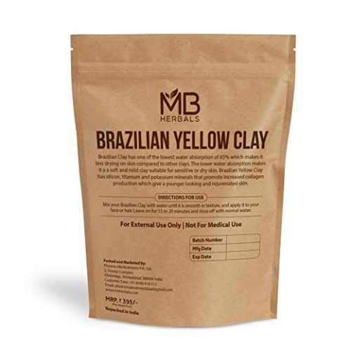MB Herbals Brazilian Yellow Clay 227g | for Face Packs & Soap Making | Skin care formulations Brazilian Clay has lowest water absorption. Hence it is softer than other clays. Brazilian Clay is close the skin's natural pH. Hence it is suitable to people with sensitive skin. Low water absorption of Brazilian Clay makes it more suitable to people with dry skin because this clay doesn't pull out oils like other clays. Brazilian Clay is mild. Using Brazilian Clay is simple. Just make a paste with water and apply it on face. Leave it for a few minutes and rinse the face with water.Our Brazilian Clay is re-packed in India. We have not added any external agent such as a preservative or a color or fragrance to this clay. We have simply repacked from the bulk pack. No Preservative. No External Color or Fragrance.