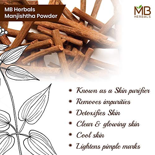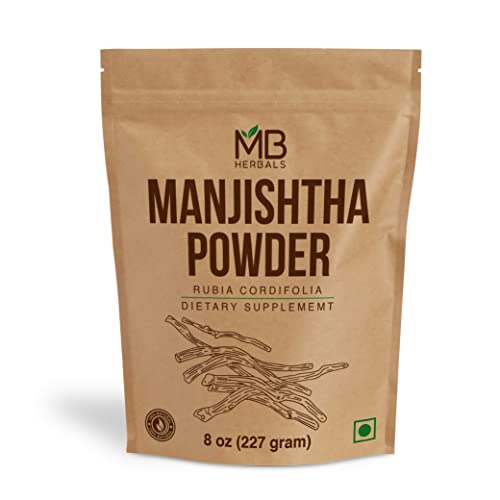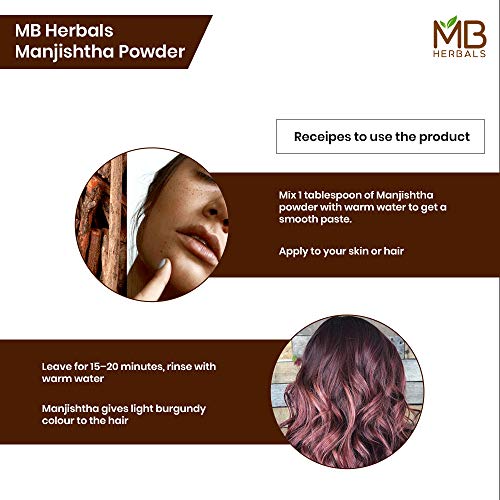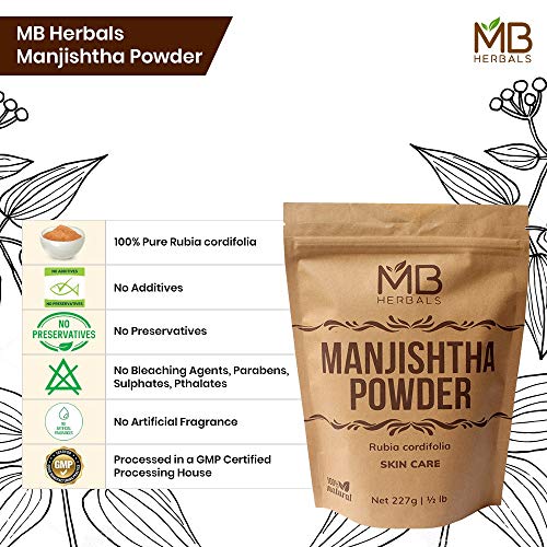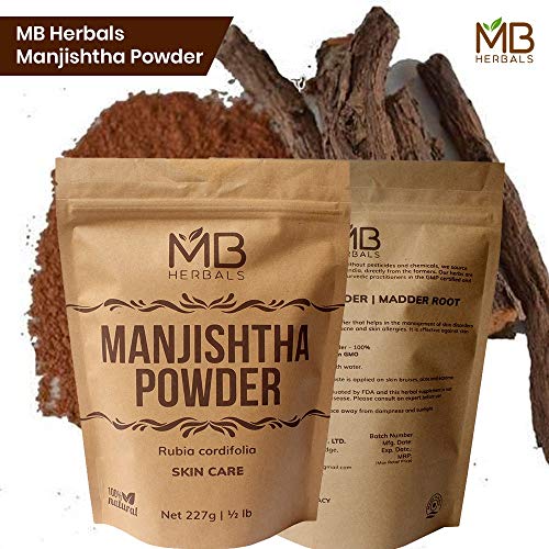 MB Herbals Manjishtha Powder 227g 100% Pure rubia cordifolia root powder - no added preservatives (No Parabens No Sulphates). No fillers. Processed by gujarat FDA registered and gmp certified facility Manjistha is an effective blood detoxifier that helps in the management of skin such as hyper - pigmentation eczema acne and skin allergies. It is effective against skin ageing and reduces age spots Manjistha is an essential ingredient of a face mask. It is used to brighten the skin complexion. It helps to lighten the blemishes and age related dark spots Manjistha is also used as a hair conditioner and a hair colorant. It gives burgundy hair color when mixed with henna and applied on grey hair. The color doesn't last long but it is a safer alternative to color burgundy hair compared to the chemical hair dyes based on ammonia and ppd