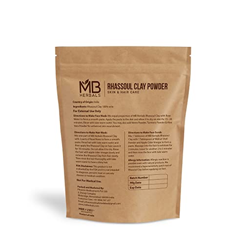 • Direction of use: MB Herbals Rhassoul Clay can be used as a singular ingredientwith water in Face Mask and Hair Mask and it can be combined with Fuller's Earth (Multani Mitti) and herbs.