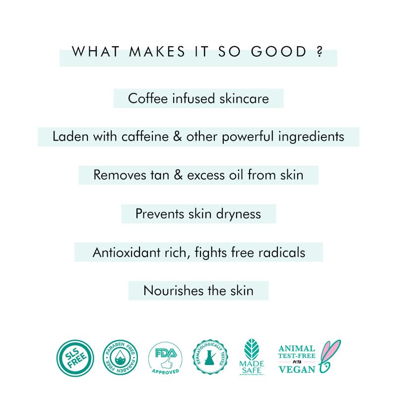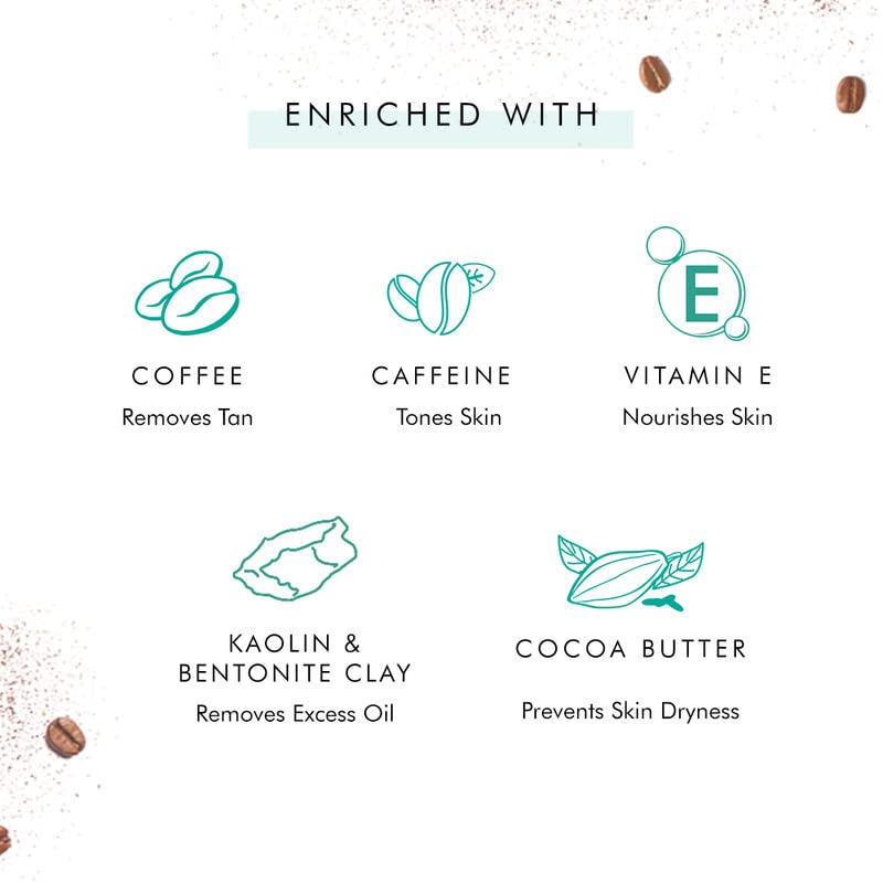 GENTLE EXFOLIATING CARE AND OIL BALANCE for the face that becomes dull lifeless and rough due to dead skin cells blackheads impurities everyday exposure to pollution and tan| mCaffeine coffee face mask has been designed for this delicate purpose. A clay b