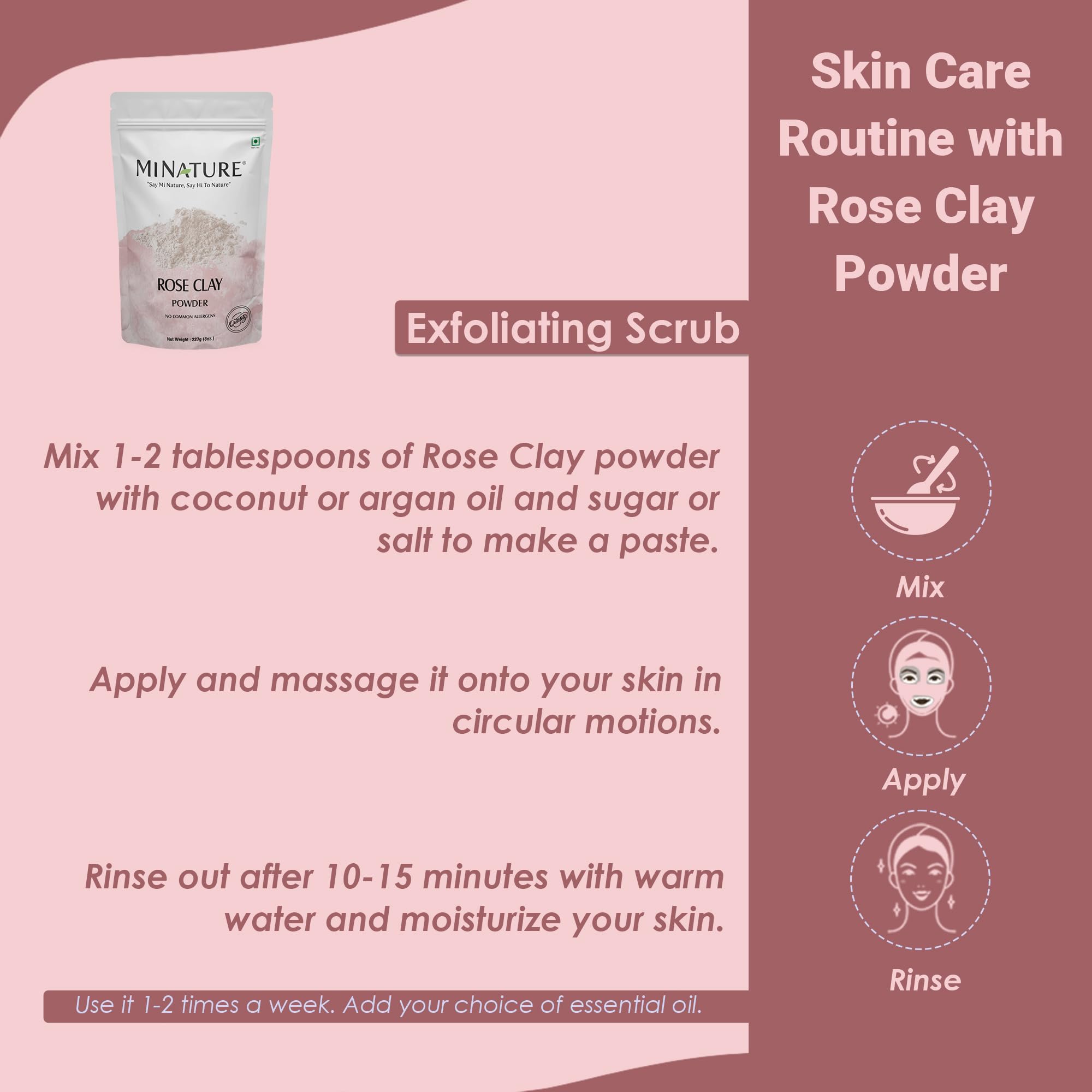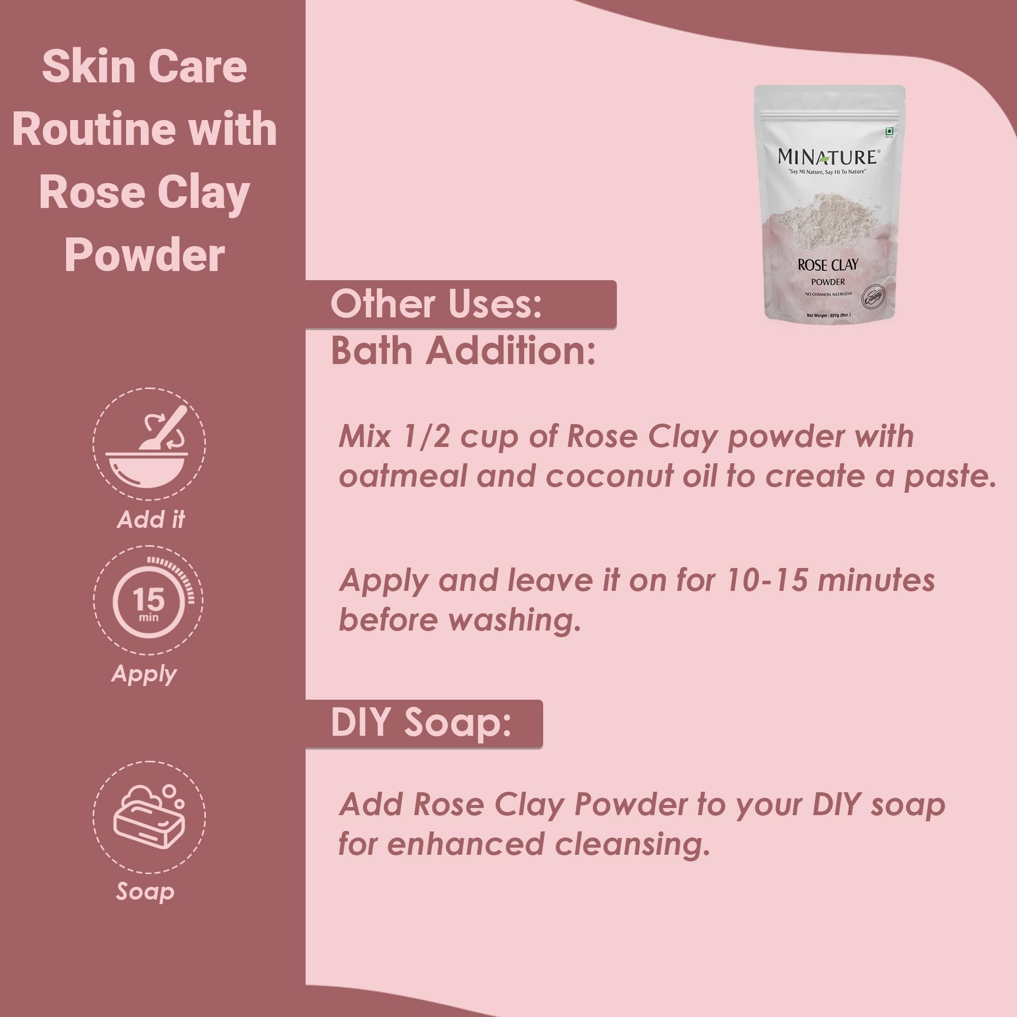 100% PURE PREMIUM CLAY: Mi Nature Rose Clay (Pink Kaolin) Powder is carefully sourced and minimally processed to preserve its beneficial properties - free from additives fillers and artificial ingredients.