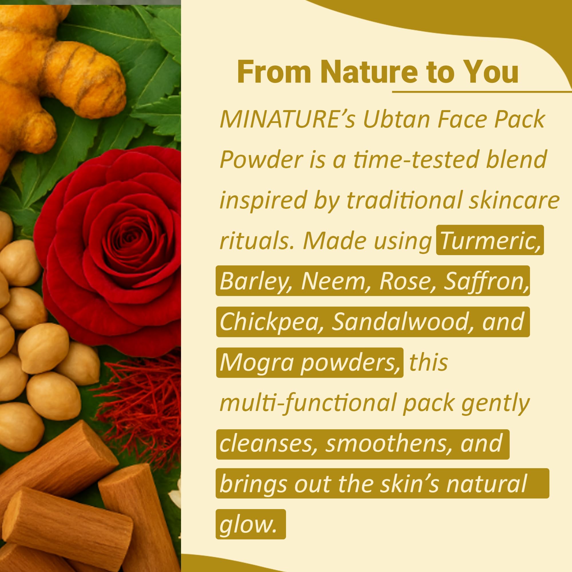 mi nature Ubtan Face and Body Pack |Turmeric Barley Chickpeas Neem sandalwood Mograflower Saffron & Rose Petal |Remove Acne |Pure & Natural Traditional skincare |1 Stop Solution |100g (4oz)