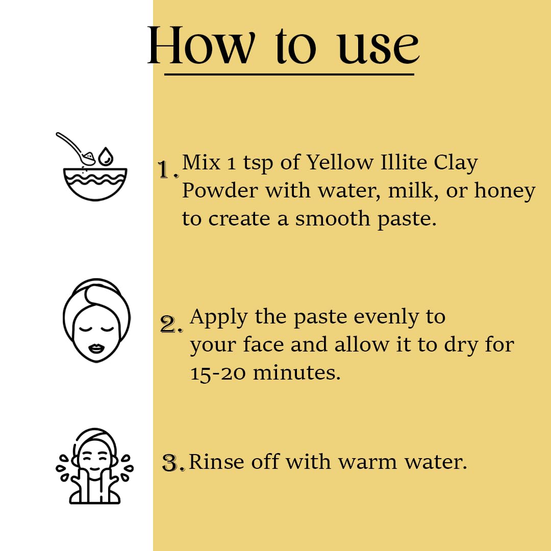 â¤Mi Nature Yellow Illite Clay Powder is a premium skincare ingredient that offers a myriad of benefits for your beauty and self-care routines. Meticulously sourced and crafted in India this 100% pure and natural yellow illite clay. âKey FeaturesâPure & Natural Mi Nature Yellow Illite Clay Powder is free from additives preservatives and synthetic ingredients ensuring that you experience the unadulterated goodness of nature. Its natural composition makes it an ideal choice for those seeking a holistic approach to skincare.Versatile UsageThis clay powder is a versatile addition to your DIY skincare arsenal. Whether you're creating masks soaps balms or scrubs its fine texture and high purity make it easy to incorporate into various formulations. Unleash your creativity and tailor your skincare products to suit your unique needs.Gentle CareFormulated with care in mind this clay powder provides gentle care. It is suitable for all making it a versatile option. Experience the soothing and calming effects as you pamper your skin with this natural wonder.Chemical & Cruelty-FreeMi Nature takes pride in offering a product that is free from harmful chemicals and has not been tested on animals. You can indulge in your beauty rituals with the assurance that this clay powder aligns with ethical and cruelty-free standards.ð§¬Non-GMOThe Yellow Illite Clay Powder is Non-GMO reflecting a commitment to providing a product that is in harmony with nature. This ensures that you receive a product untainted by genetically modified organisms supporting a more natural and sustainable.â¤Elevate your skincare routine with Mi Nature Yellow Illite Clay Powderâa pure and versatile ingredient that embodies the essence of natural beauty care.