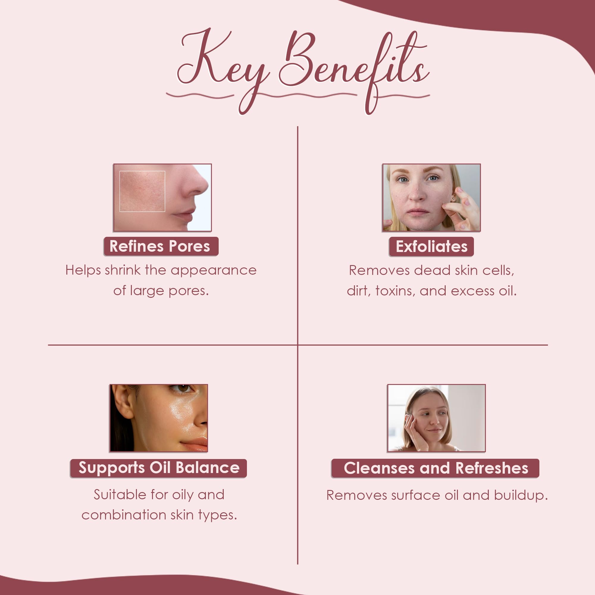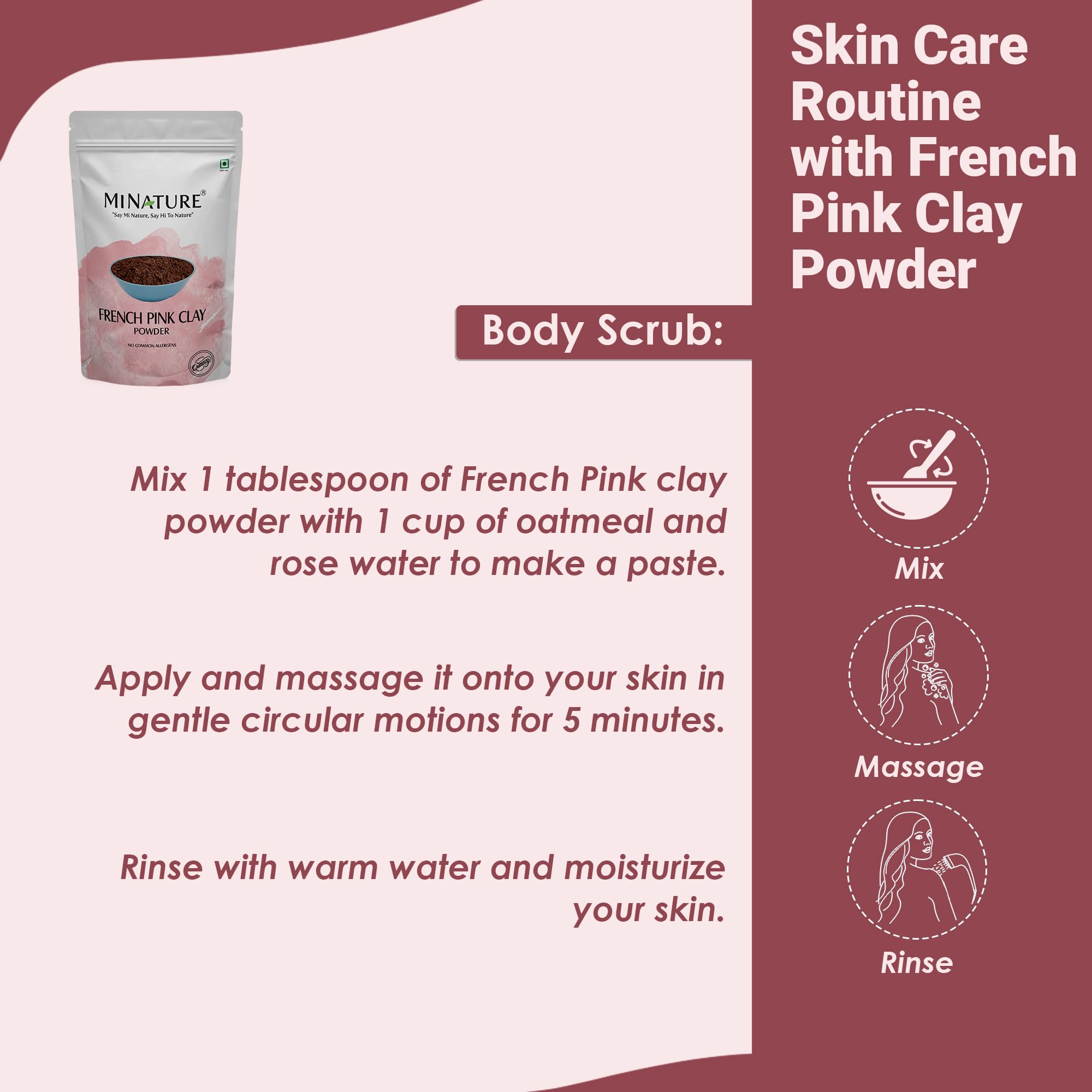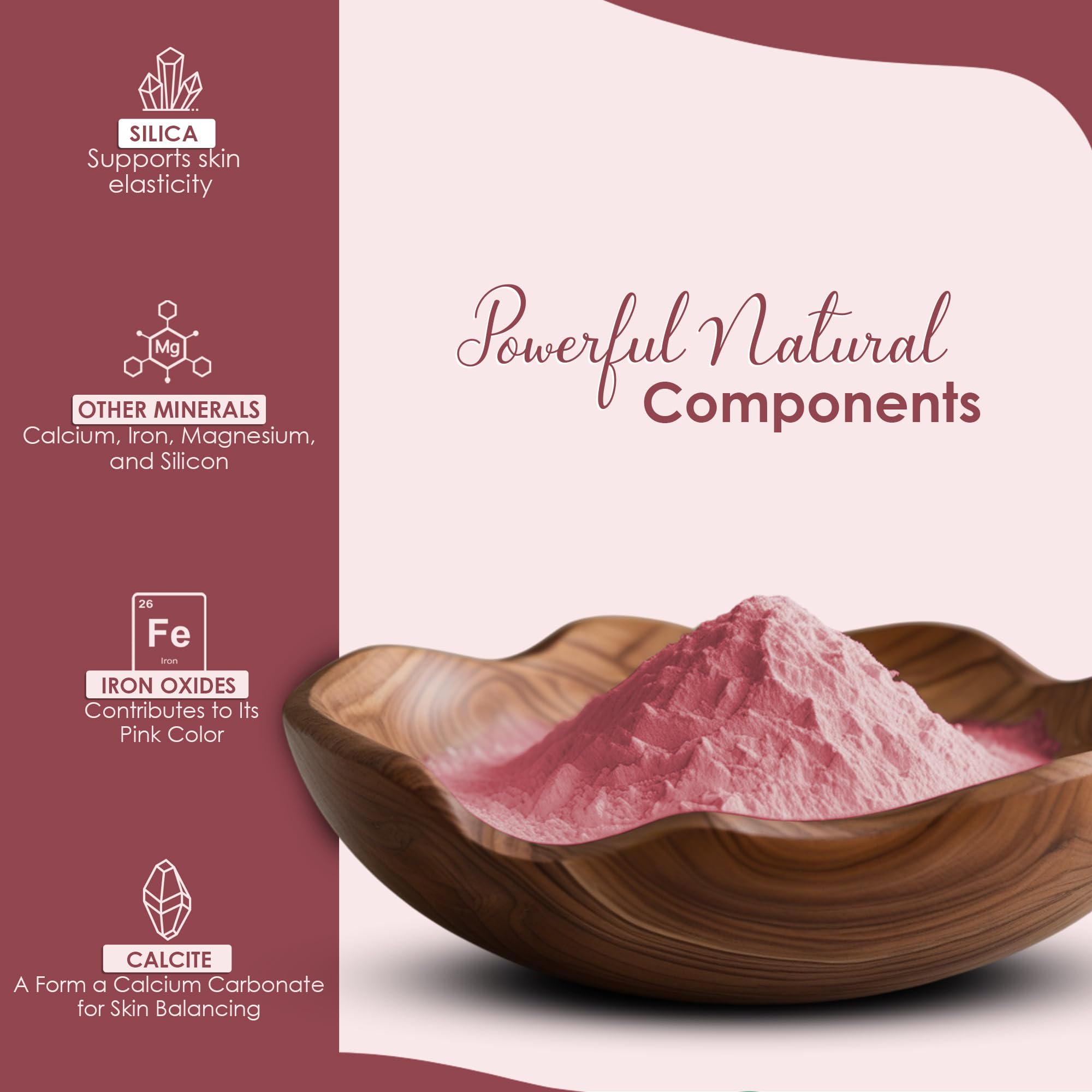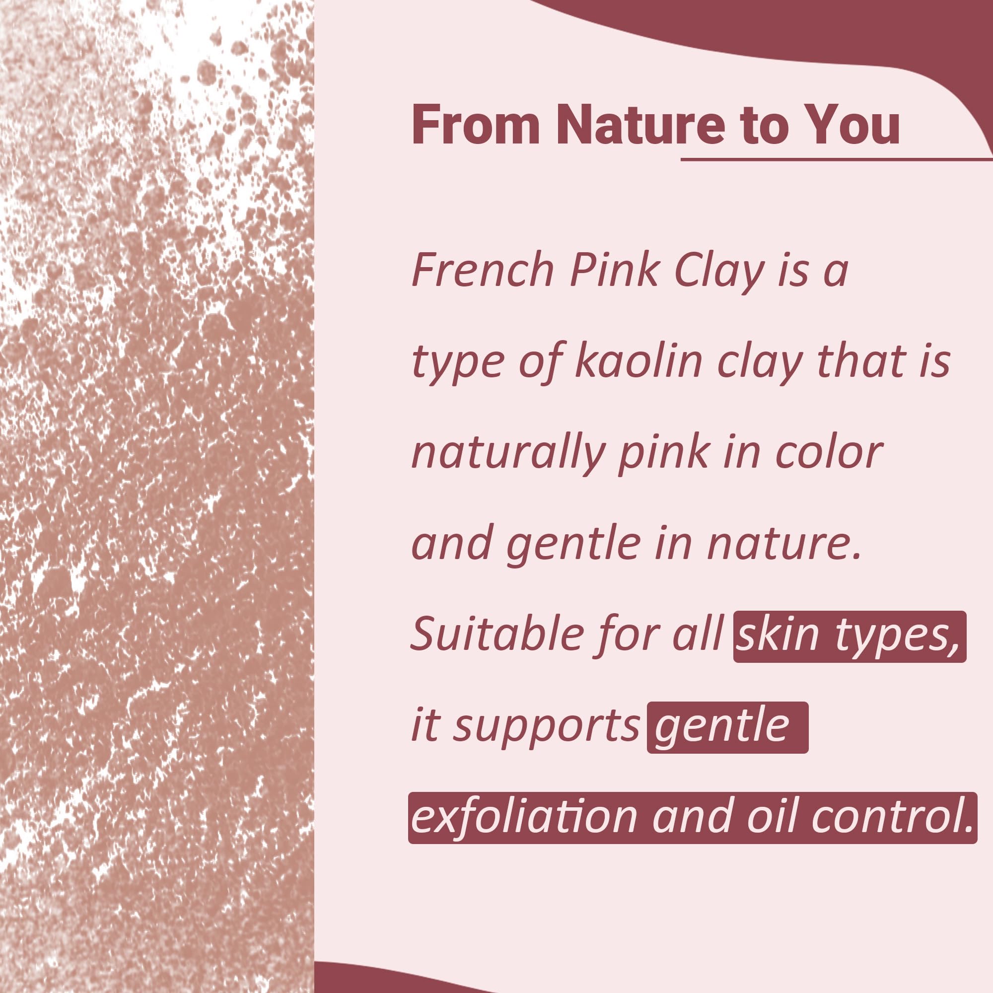 Oil Control & Pore Minimizer: French Pink Clay is renowned for its oil-absorbing properties helping to balance oily skin and reduce shine. It also works to minimize pores giving your skin a smoother more even appearance. French Pink Clay can be used to cl