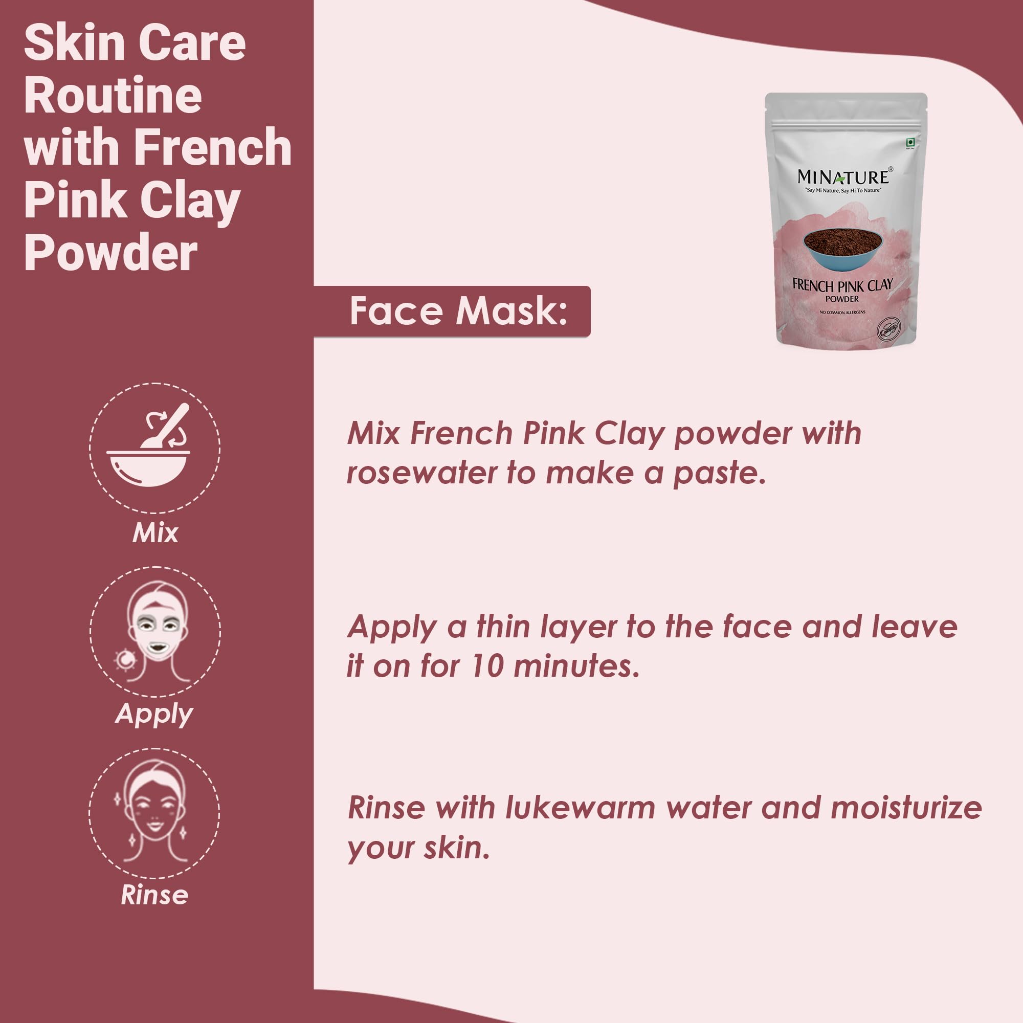 100% Pure French Pink Clay: Sourced from the pristine regions of France this natural Montmorillonite clay offers a gentle yet effective way to rejuvenate your skin and hair free from harmful chemicals.