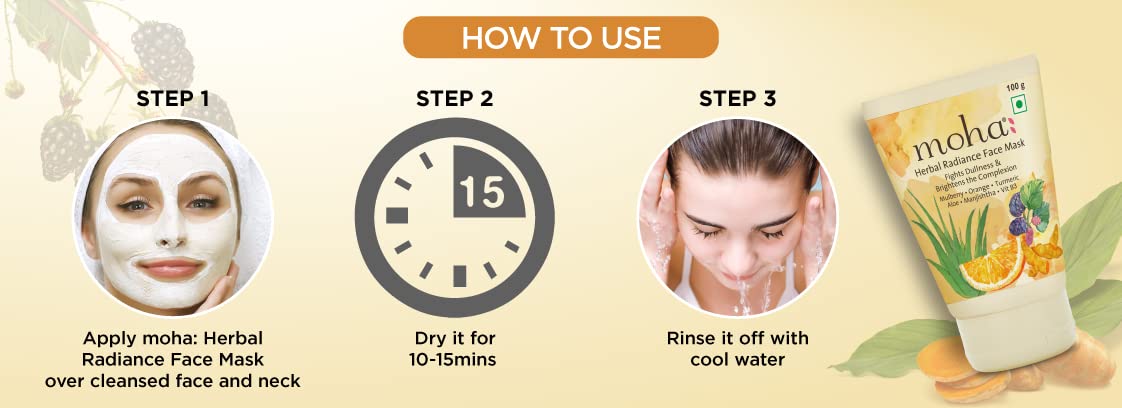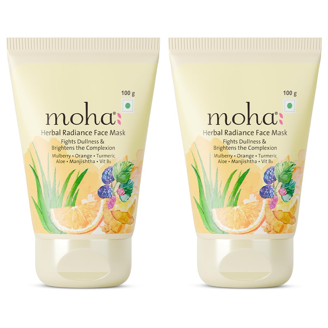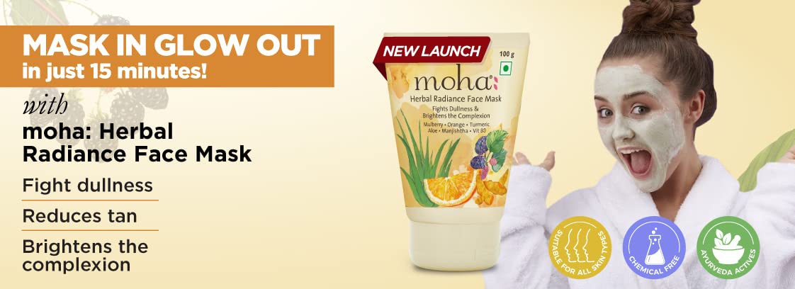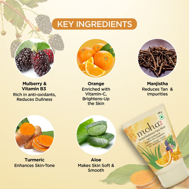 100% Ayurvedic formula enriched with the goodness of skin-lightening and natural nourishing ingredients moha: Herbal Radiance Face Mask helps to:Reduce dullness and brightens the complexionRemove excess oil dirt and reduces pimple break-outsReduce tan improves skin toneTighten the poresResult in radiant youthful and glowing skinmoha: Herbal Radiance Face Mask is suitable for all skin types and is free from Parabens Sulfates Silicones etc. harsh chemicals.Treat your skin with the goodness of nature and powerful Ayurvedic ingredients to get the bright & glowing skin you deserve with moha: Herbal Radiance Face Mask. This is a 100% natural and nourishing formula powered with various anti-oxidants fights dullness removes tan and brighten-up the complexion in just 15-minutes!