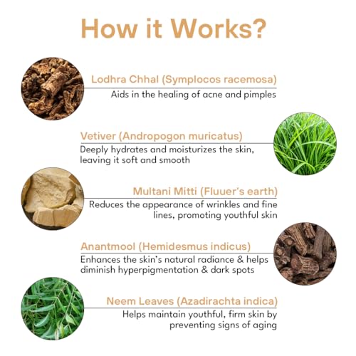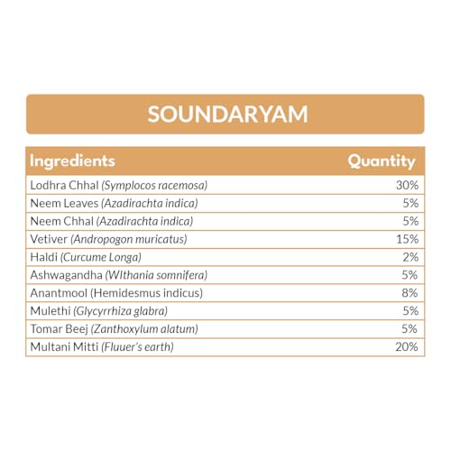 Soundaryam Ubtan Reduces Signs of Skin Damage The all natural Ubtan heals active acne and pimples It Gives you a healthy and glowing skin Soundaryam helps to retain skin moisture. It Contains No Parabens and Sulphates (100% Natural) Soundaryam has an essence of vetiver with a richness of more than 10 natural herbs.How to Use Soundaryam Face Mask Step 1- Wash your face with a sulphate free face wash suiting your skin type. Step 2- Dab your face dry add a few drops of rose water or aloe vera gel and make a thick paste of Soundaryam face pack. Step 3- Apply a generous layer of Soundaryam face mask on a clean face. Keep it for 15 minutes scrub & wash off with lukewarm water. Step 4- For best results use twice a week.