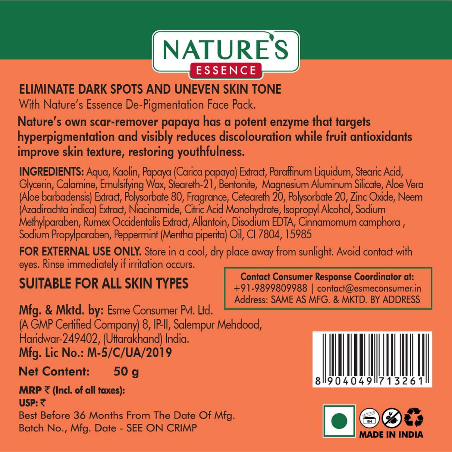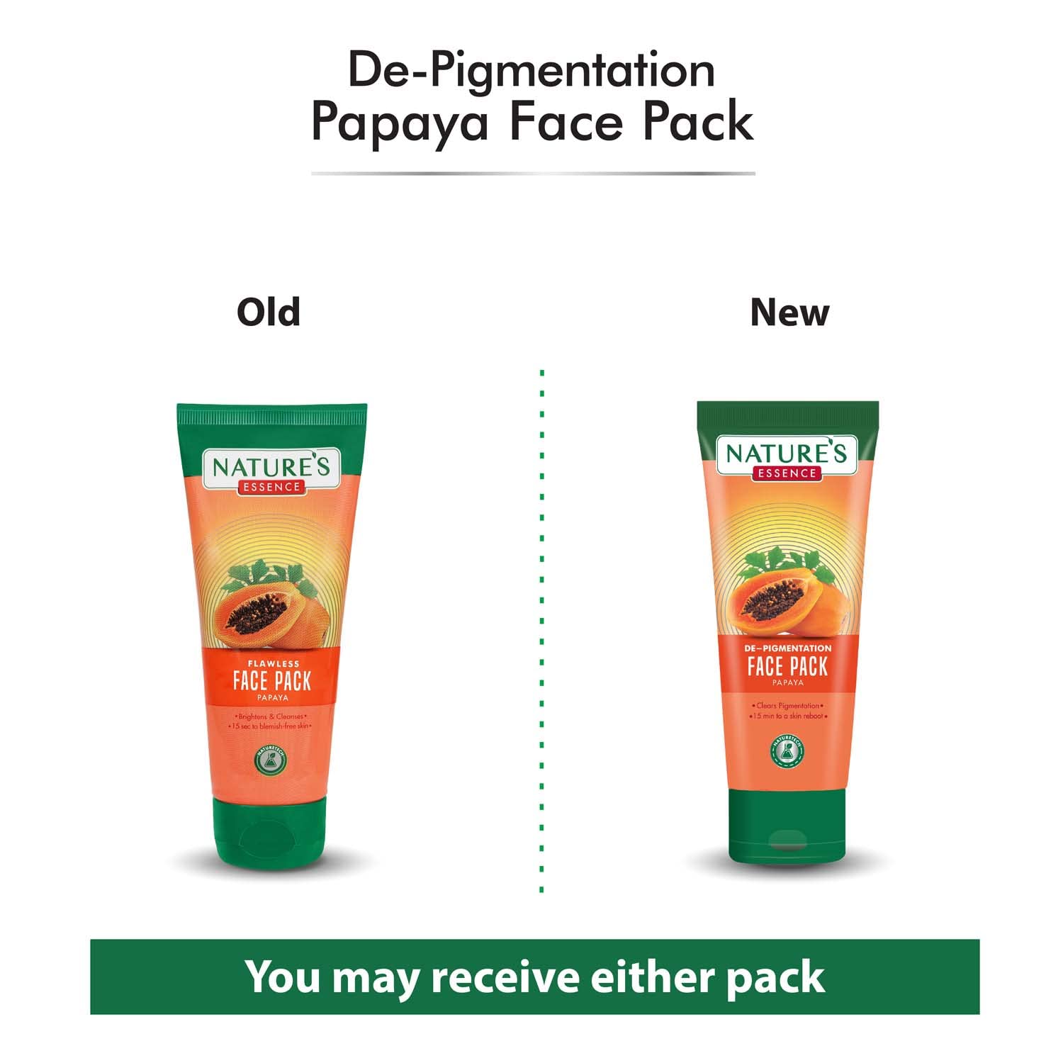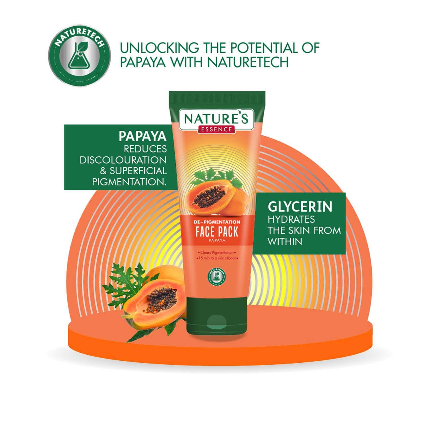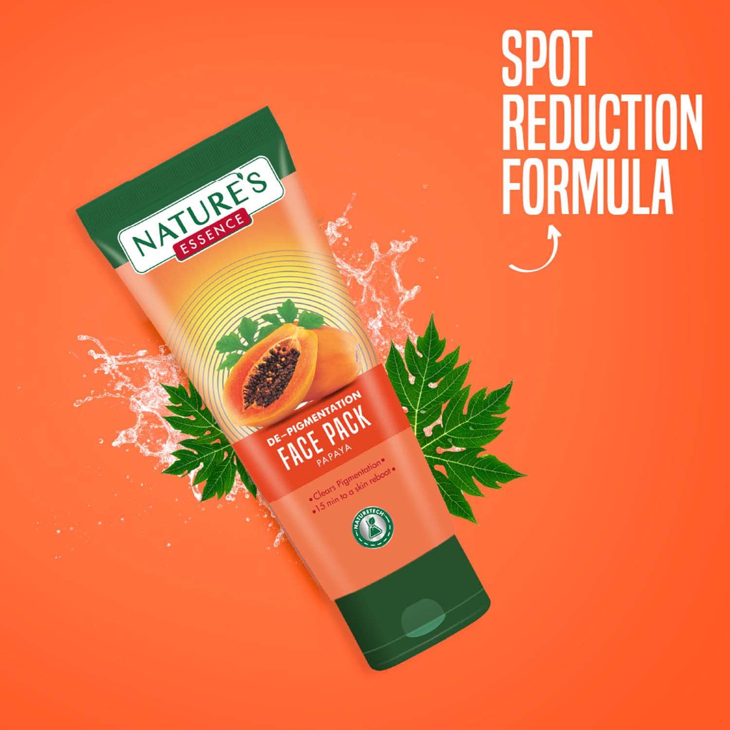 Eliminate dark spots and uneven skin tone with Natures Essence De-Pigmentation Papaya face pack. Natures own scar-remover papaya has a potent enzyme that targets hyperpigentation and visibly reduces discolouration while fruit antioxidants improve skin texture restoring youthfulness. Suitable for all skin types.