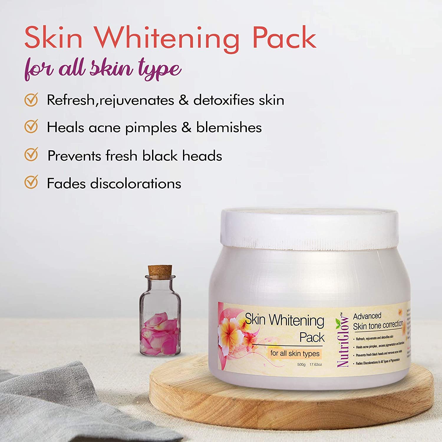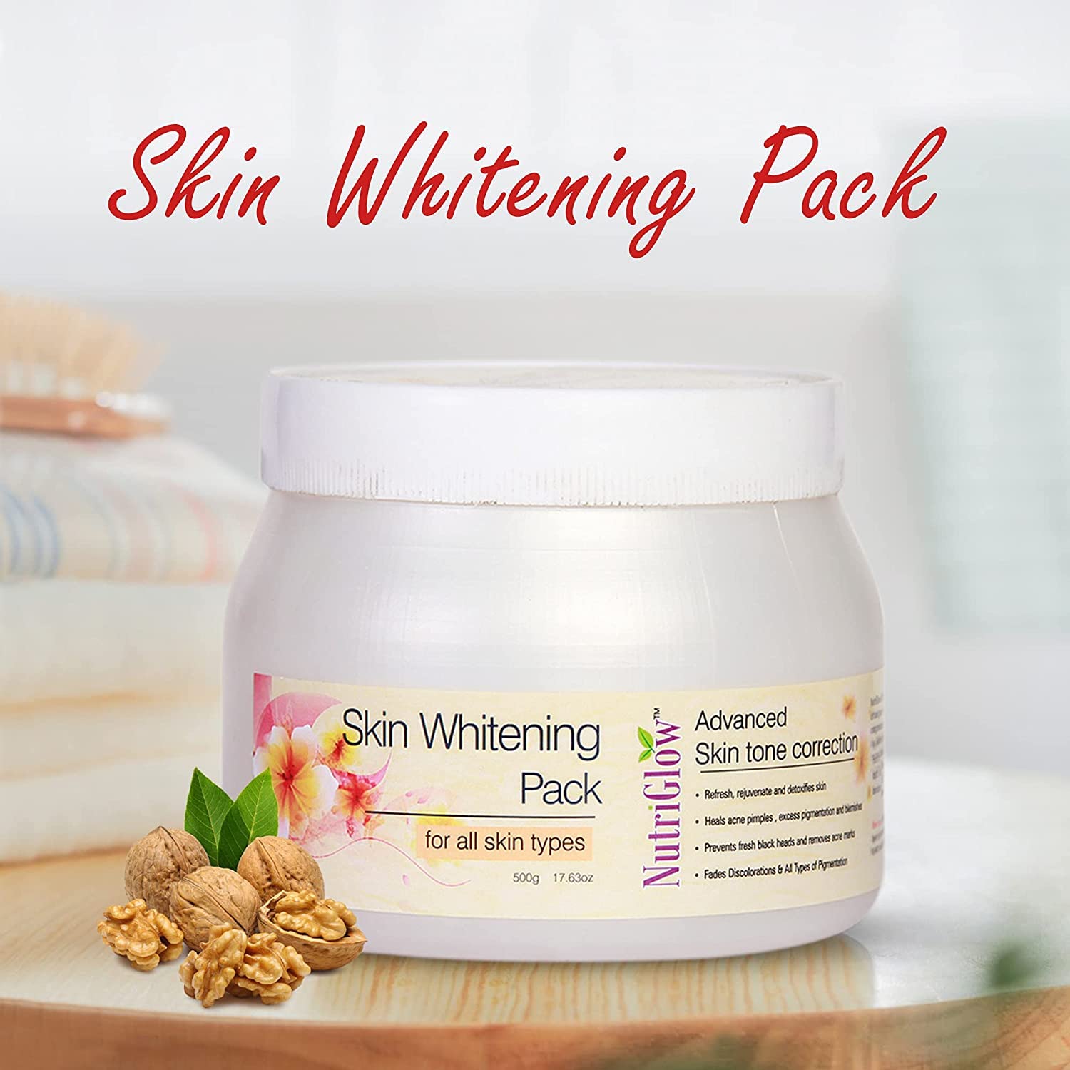 • NutriGlow Skin Whitening Face Pack is infused with brightening and soothing properties which gently help remove the skin surface right before giving a glowing look