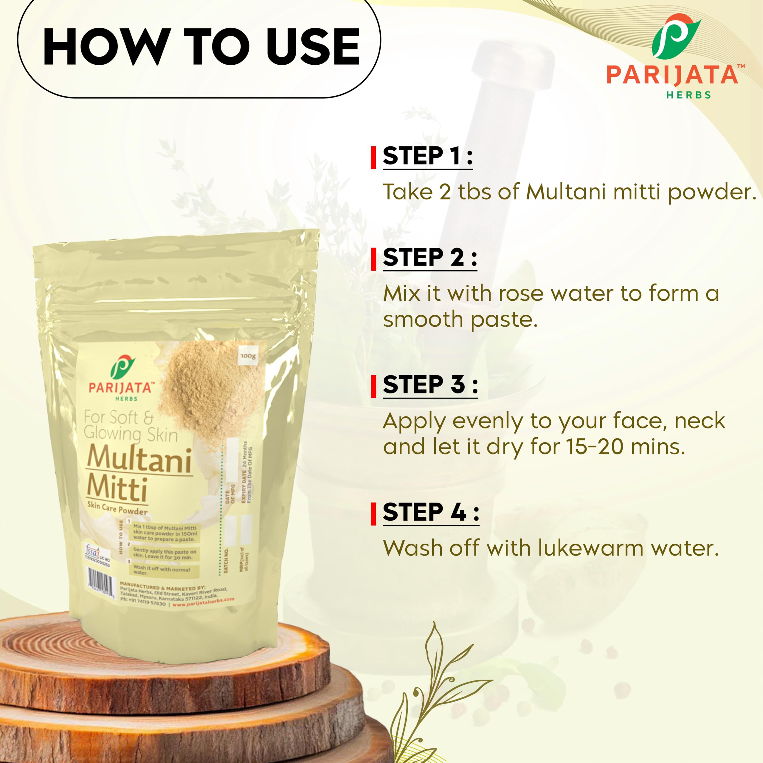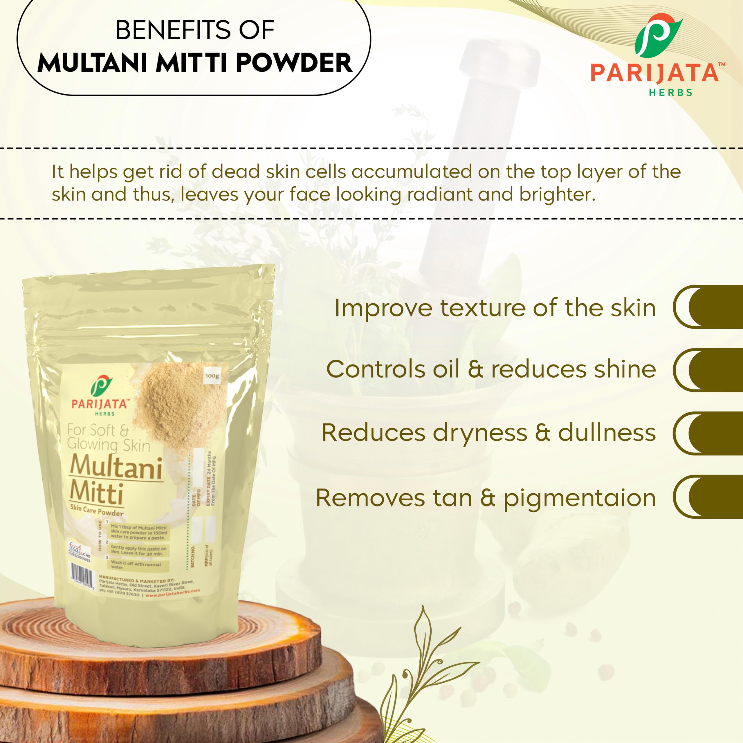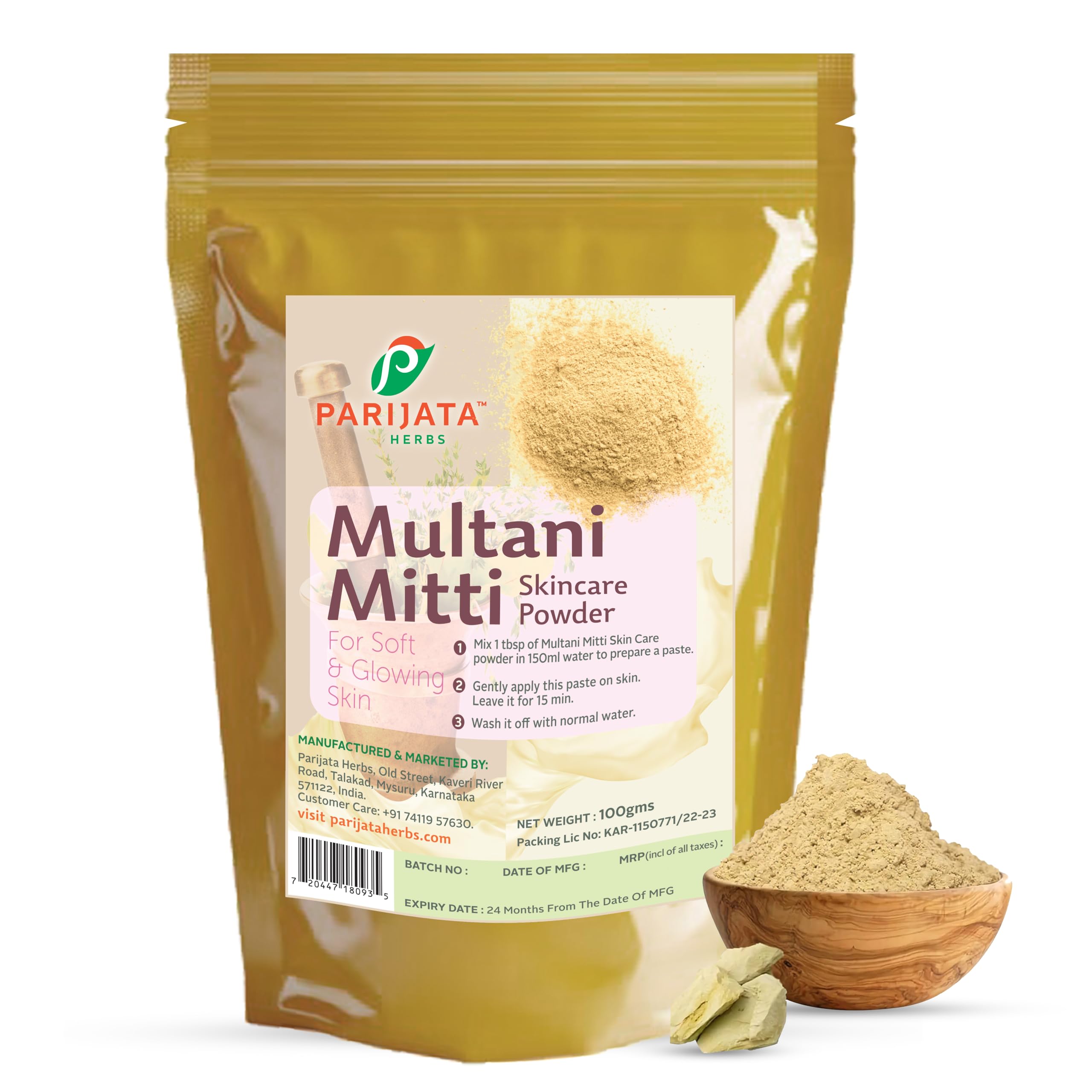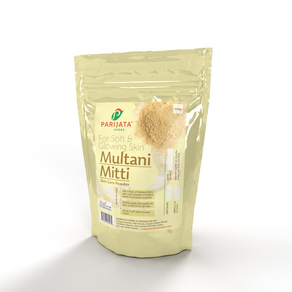 PARIJATA HERBS presents a natural Multani Mitti that helps to clean all the oil dirt and dead cells that have accumulated on the skin due to exposure to the sun and pollutions It nourishes your skin with its rich content of minerals keeping it healthy and preventing further breakouts. You can also use multani mitti even to apply it on your hair for shiny healthy locks. Apart from fading blemishes and lightening pigmentation this natural ingredient also helps get rid of a bad suntan. It also helps tighten the skin which further reduces wrinkles and fine lines. ✔ For Toning :It helps in improving the skin tone and gives a bright glow and radiance on the face; its bleaching effect helps in lightening the blemishes and acne marks too. Multani Mitti provide glowing skin by getting rid of all the impurities from your skin and by unclogging your pores.✔ For Cleaning :Multani mitti is a very good cleanser; it cleanses on the surface as well as deeper action. It takes out all dead skin cell and makes room for the pores to breathe. It can regularize oil production for both oily and dry skin types this is what makes it an effective tool against acne.✔ For Scrubbing : Multani mitti is a perfect scrubber that tackles puffiness dark circles and other skin problems; it can also remove blackheads and whiteheads completely. Fuller's earth is one of the most cumulating mitti. ✔ Useful in Skin Care : It reduces pigmentation and sun tan. Reduces oiliness of skin and Improves texture of the skin. Fuller's earth is one of the most commonly used ingredient in home made soaps Multani mitti helps in smoothening as well because of its properties. Get a gorgeous nourishing skin glow from within & making it glow naturally.