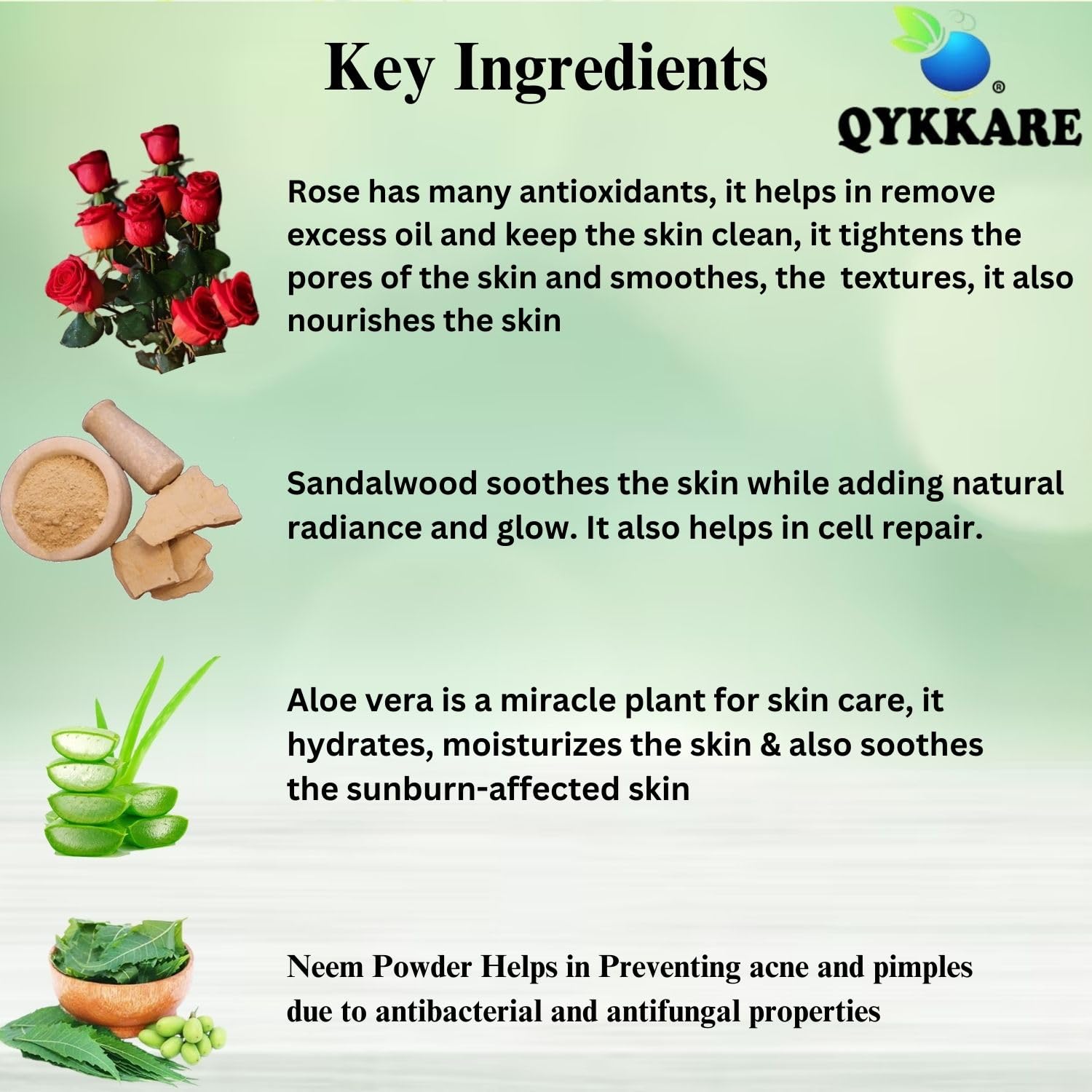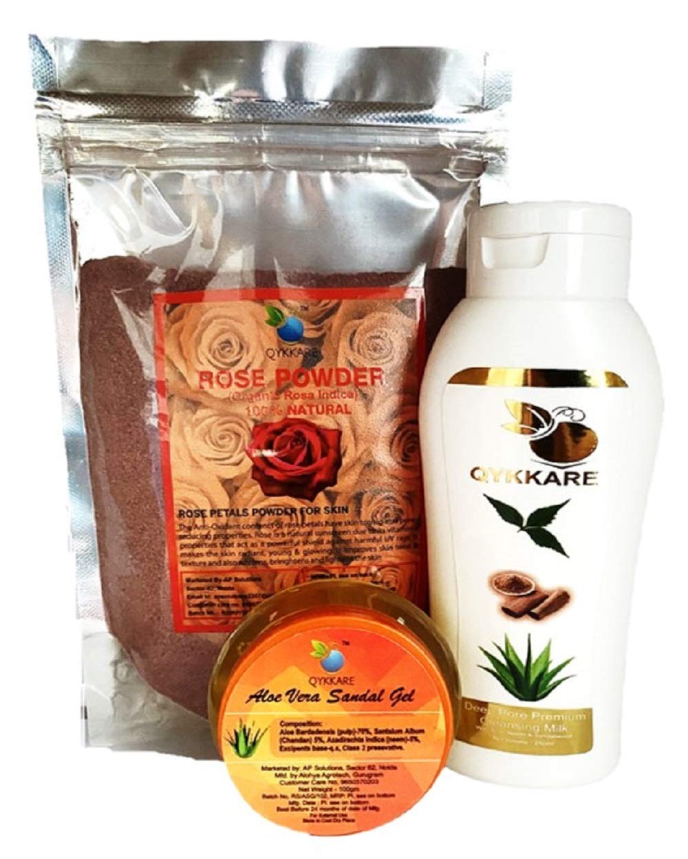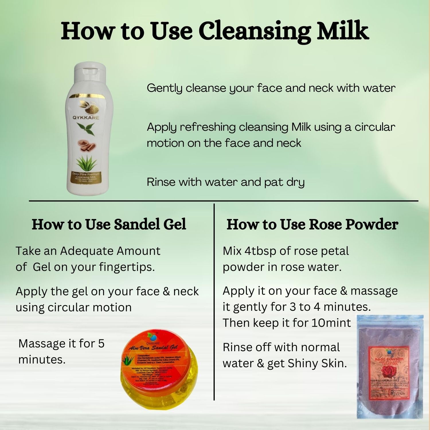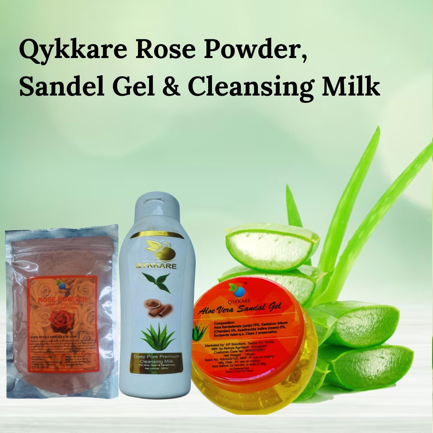 QYKKARE Natural Cleansing and Hydrating Face Care Kit - Cleansing Milk Sandal Gel & Rose Powder