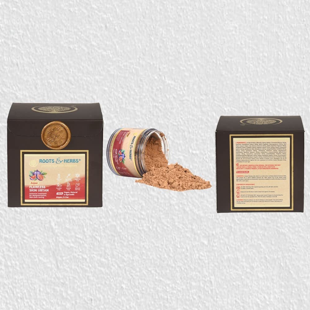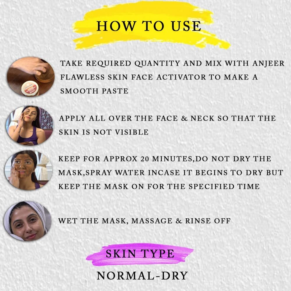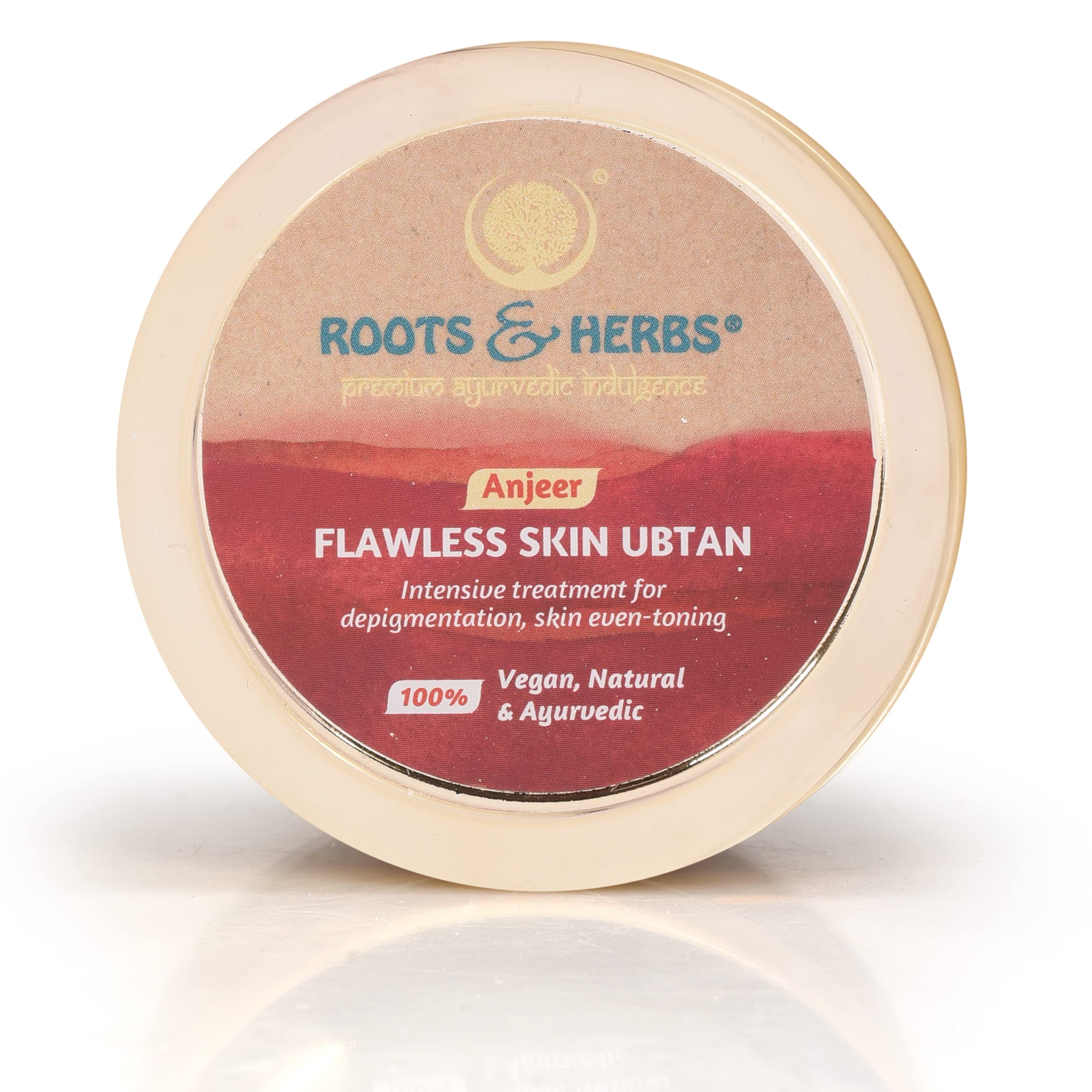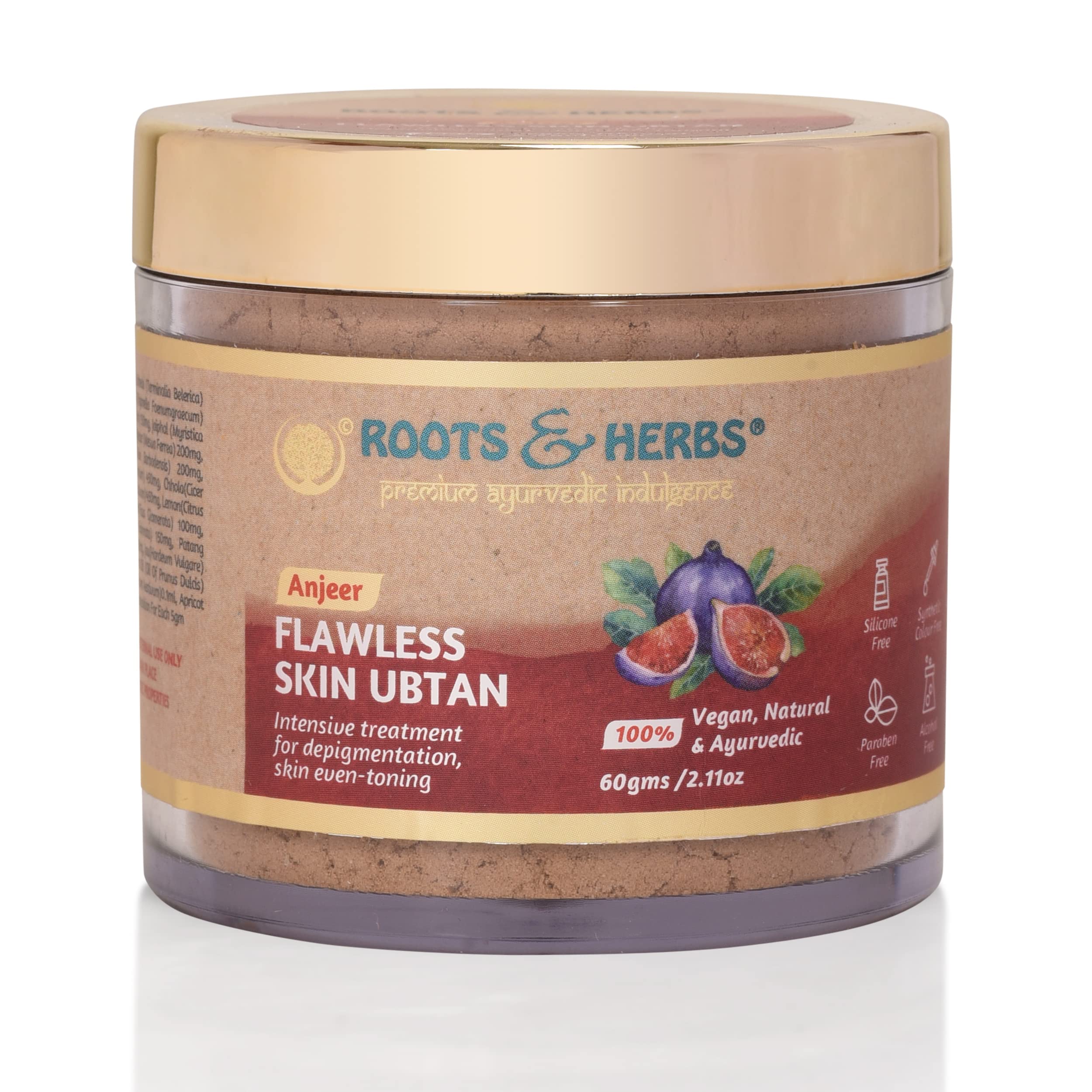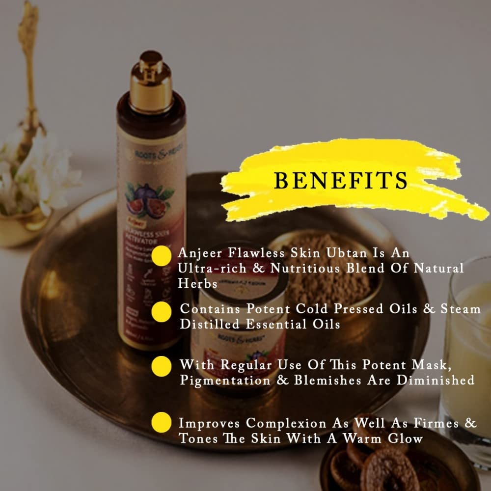 Roots and herbs brings you ayurvedic natural treatment anjeer flawless skin face ubtan which is a perfect combination of natural herbs and cold pressed oils and steam distilled essential oils. It comes as an ayurvedic natural treatment which improves the complexion after regular use. This face pack for oily skin offers you smoother and younger look. Ingredients: Green cardamomum anjeer fruit extract anjeer leaf extract jaiphal calendula petal Indian gooseberry extract ghrita kumari extract water hyssop extract brahmamanduki extract Indian madar extract liquorice extract k khadira cold pressed rosehip oil cold pressed evening primrose oil steam distilled saffron Steam distilled ylang Steam distilled lavender Sodium benzoate. Frequency - this face pack for normal skin should be used 4-5 days a week. Continuous use for 6-8 weeks will bring a noticeable difference. Skin type - this face pack for glowing skin is ideal for dry pigmented freckled and blemished skins. Application - use this skin brightening face pack after cleansing. Take the required quantity and mix with anjeer flawless skin activator to make a smooth paste. Apply all over the face and neck. When semi-dry wet the mask massage and rinse off. Follow up with pomegranate kaya kalp elixir moisturizer.