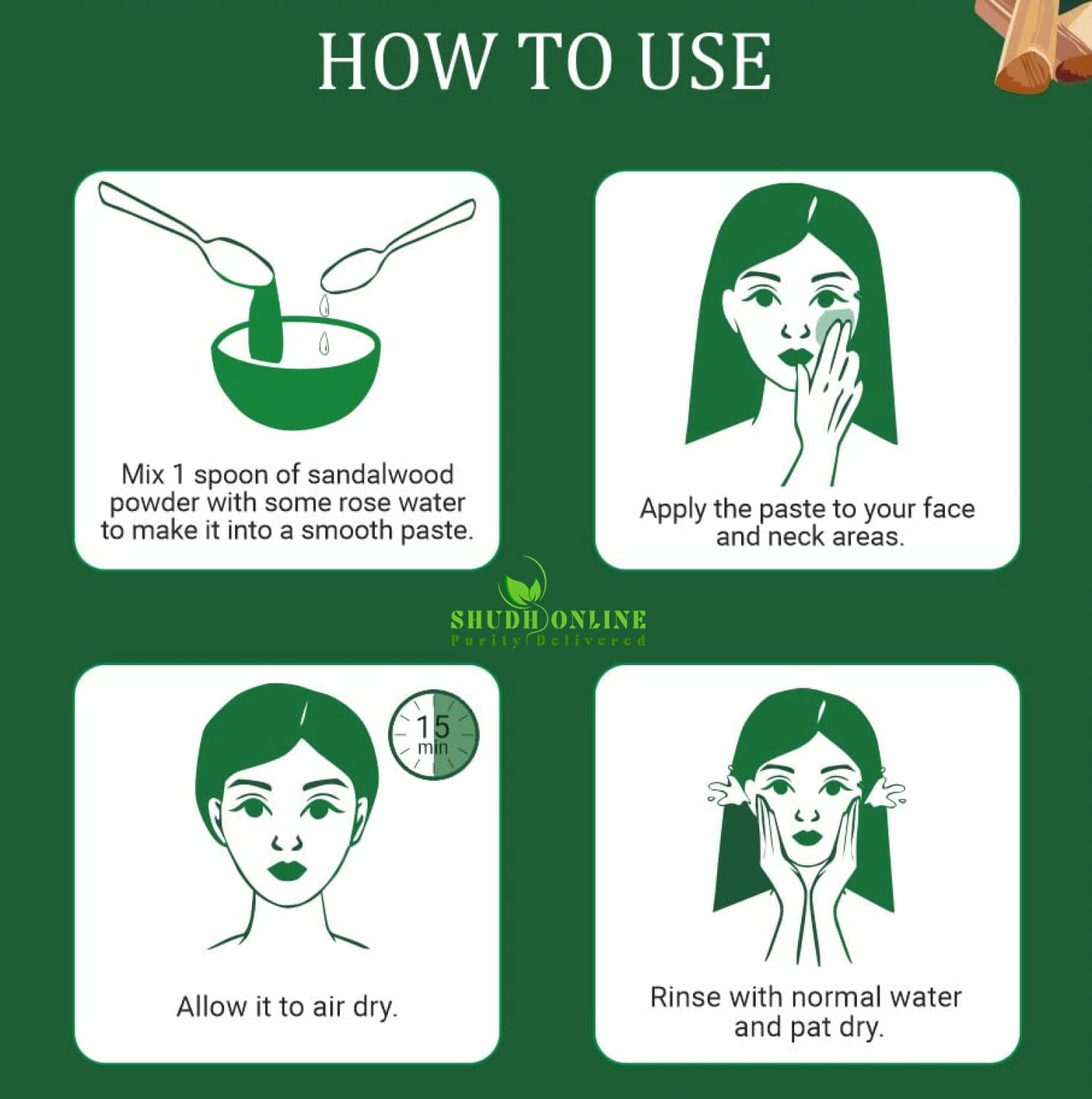 • HOW TO USE - Sandlewood can be made by mixing the face pack with water and make a thick paste. You can rinse it with lukewarm water and pat it dry. You can apply this paste to your skin and leave it for around 30 minutes. Apply and use regularly for a ref