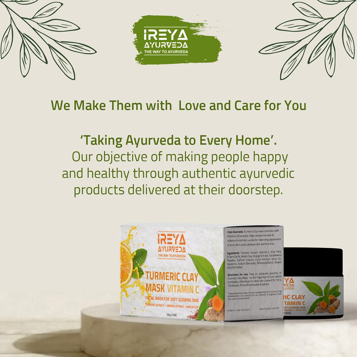 This turmeric vitamin C clay mask is a natural and effective way to cleanse and rejuvenate your skin. It is made with a blend of turmeric extract vitamin C orange and saffron extracts fuller's earth kaolin clay making it a powerful tool for achieving clear glowing skin. vitamin C helps to brighten and even out skin tone. The orange and saffron extracts also contain powerful antioxidants that help to protect skin from damage caused by free radicals. Fuller's earth is a natural clay that has a gentle yet effective exfoliating effect which helps to remove dead skin cells and unclog pores. Kaolin clay is a milder clay that helps to absorb excess oil and impurities while also providing a soothing and cooling effect on the skin. This turmeric vitamin C clay mask is easy to use and gentle on the skin. Simply apply a thin layer to clean dry skin and leave it on for 10-15 minutes before rinsing off with warm water. It is suitable for all skin types and can be used daily for optimal results.
