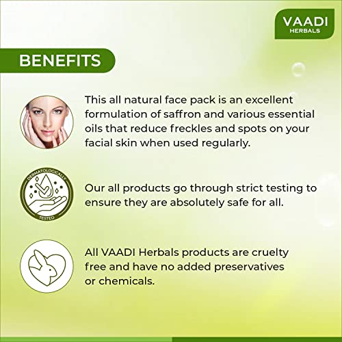 Enriched with pure sandal paste this scientifically designed face pack reduces fine lines and wrinkles and improves skin elasticity. It also removes pigmentation marks and blemishes. Makes your skin fairer super smooth and clear. Why does skin become dull and rough with age? Maturing skin becomes more susceptible to external damage as the outermost layer (epidermis) thins out. More UV-induced damage leads to age spots and pigmentation; as well as generation of more cell-damaging free radicals. Also the rate of generation of newer healthier cells decreases; consequently so does the skin's ability to heal itself. Furthermore the natural exfoliation process (desquamation) lessens; leading to accumulation of dead cells. Even the collagen production drops; causing wrinkles and sagging. Lose skin may be accompanied by enlarged pores; making the skin more prone to blackheads as well as acne and other skin infections. All these factors result in the skin looking dull rough and old. What is Saffron and how does it help revitalize skin? Saffron or kesar a derivative of Crocus sativus' flower has been used since centuries as a cleanser toner and anti bacterial agent. It helps control acne by fighting skin infections as well as by keeping pores unclogged; by removing excess oil and dead skin cells. It is often used to lighten skin blemishes pigmentation marks sun-tan and acne scars repair dry skin and brighten and even out the complexion. In addition to being an effective skin lightening agent saffron is also a popular anti oxidant since it promotes cell regeneration and collagen formation which delays wrinkles and maintains skin's elasticity. How does Sandal paste work as a skin care agent? Sandal paste has been used since centuries to achieve a smooth vibrant and radiant complexion. It moisturizes dry skin and shrinks pores of oily skin hence controlling the oiliness. This makes sandal a great agent for use on all skin types. It also works against UV damage and helps lighten dark spots and marks caused due to acne tanning blemishes or pigmentation. The component beta-santalol present in Sandal makes it a powerful anti microbial or anti septic too which can be used to treat skin infections cuts burns acne and other skin problems. Sandal has also been known to reduce blackheads and calm inflamed or itching and irritated skin. What is Lemongrass Oil and what are its effects on skin? Lemongrass oil the well known anti microbial is extracted from the leaves of the grass Cymbopogon citrates. It is used to improve skin's elasticity and firm it up by strengthening connective tissues. Known to improve skin cells' health by improving blood circulation it also astringent properties. As an anti microbial it works against skin infections like acne. It is also used to alleviate perspiration. As an astringent it reduces skin's oiliness and blackheads while unclogging and shrinking open pores. It can also be used as an anti inflammatory for skin rashes or redness. What do multivitamins do to benefit the skin? Vitamins A B C and E together show a synergistic effect on the skin. They smooth the skin texture as well as even the skin tone. The former is done firstly by their anti-oxidant nature. They boost collagen formation and cellular renewal process; and fight free radicals. In totality they minimize wrinkling and other signs of skin aging; as well as delay the appearance of others. Secondly they improve the texture by clearing the skin of dead cells; as well as by fighting and preventing problems like acne and blackheads. The former is the action of Vitamin C which also unclogs the pores and tightens them. And the latter is the effect of reduction of oiliness by Vitamins A and C; and the anti-inflammatory and hydrating action of Vitamin B. As for the evening of the skin tone Vitamins E and C lighten acne scars dark-spots and other blemishes; while Vitamins A and B take care of pigmentation spots and anomalies. Vitamin B even helps reduce red blotchiness of the skin. Furthermore Vitamins A C and E even helps reduce the damage to the skin from UV rays; while the latter two protect it from further damage as well. What is Manjistha and how does it help help the skin? The herb manjistha is also known as Rubia cordifolia or more commonly Indian Madder. Cultivated for the red pigment in its roots it also gives the skin a nice reddish tinge. It also adds glow and improves the complexion by multiple actions. Firstly it helps against a number of skin diseases as well as recurrent skin infections. The latter of which even includes acne. Secondly irritated or inflamed skin is also calmed soothed and smoothed by it. Thirdly prevents the formation of scars while fastening the healing of skin tissues. It is also effective in treatment of freckles and discoloration of the skin.