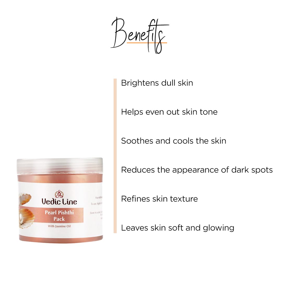 • Vedicline Pearl Pishthi Pack helps eliminate blackheads and dark spots fight pigmentation and absorbs dirt and pollutants leaving you with a moisturized youthful and radiant complexion.