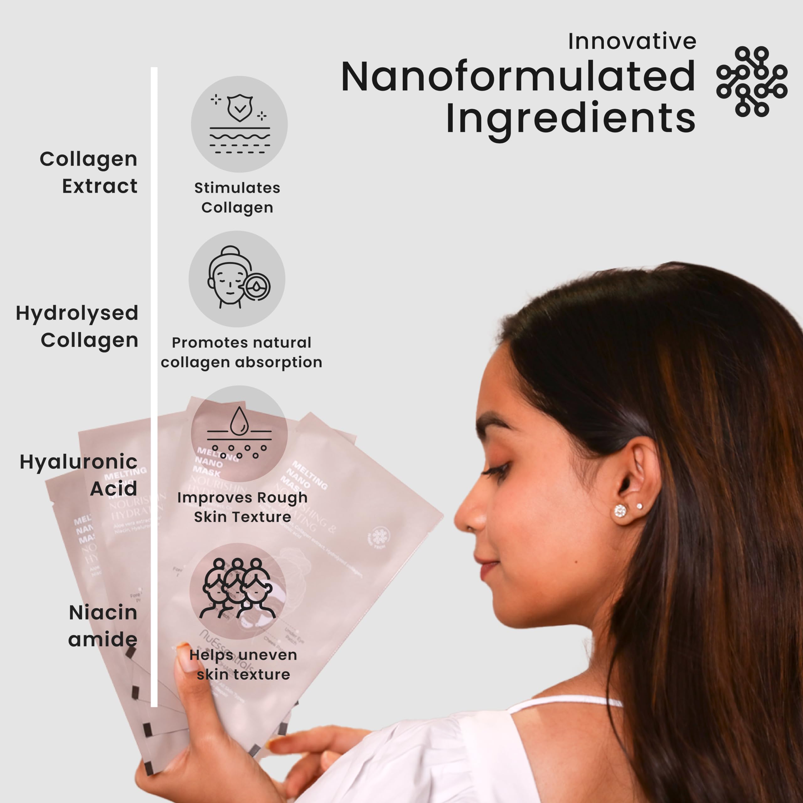 ZEROHARM Nuessentials Nourishing & Hydrating Melting Collagen Face Mask Sachet | 7X5 Sheets | Nanoformulated Collagen | Boosts Collagen | Hyaluronic Acid | Skin Hydration | For All Skin Types