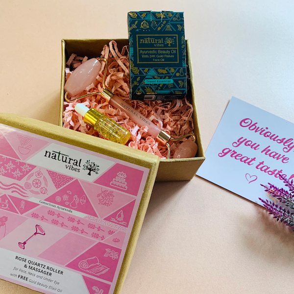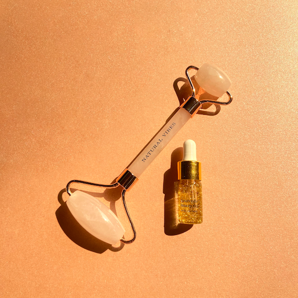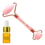 Natural Vibes Rose Quartz Roller & Massager for Face, Neck and Under eye with FREE Gold Beauty Elixir Oil