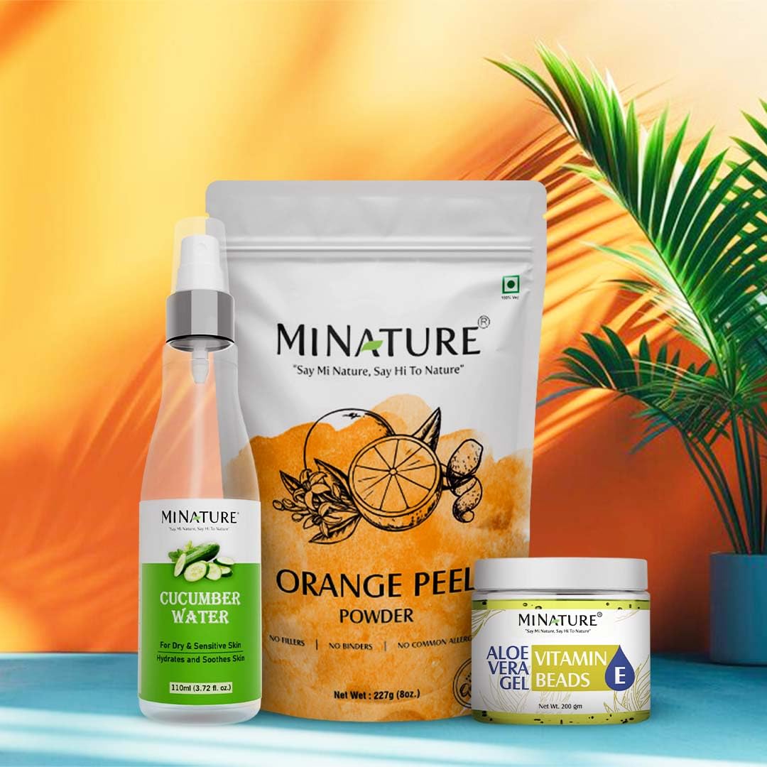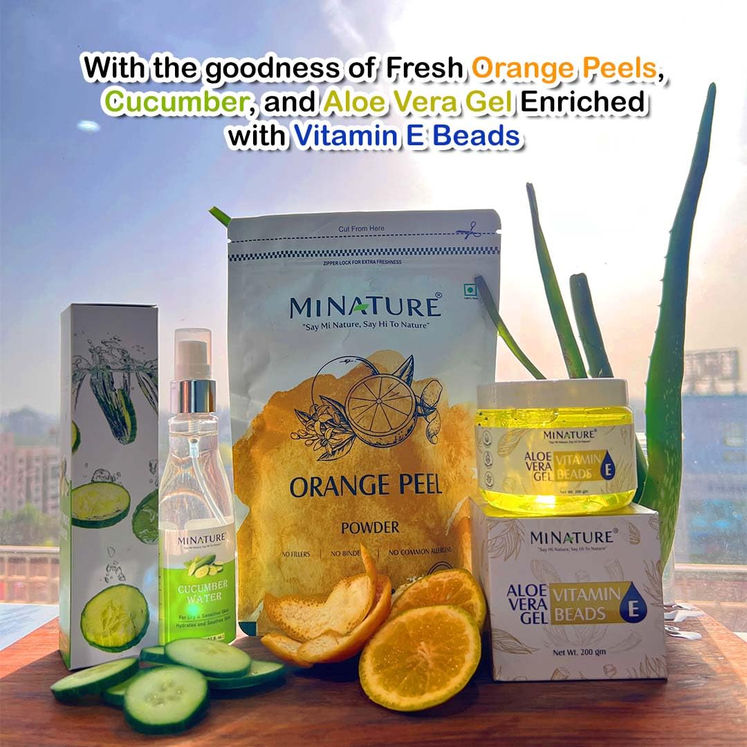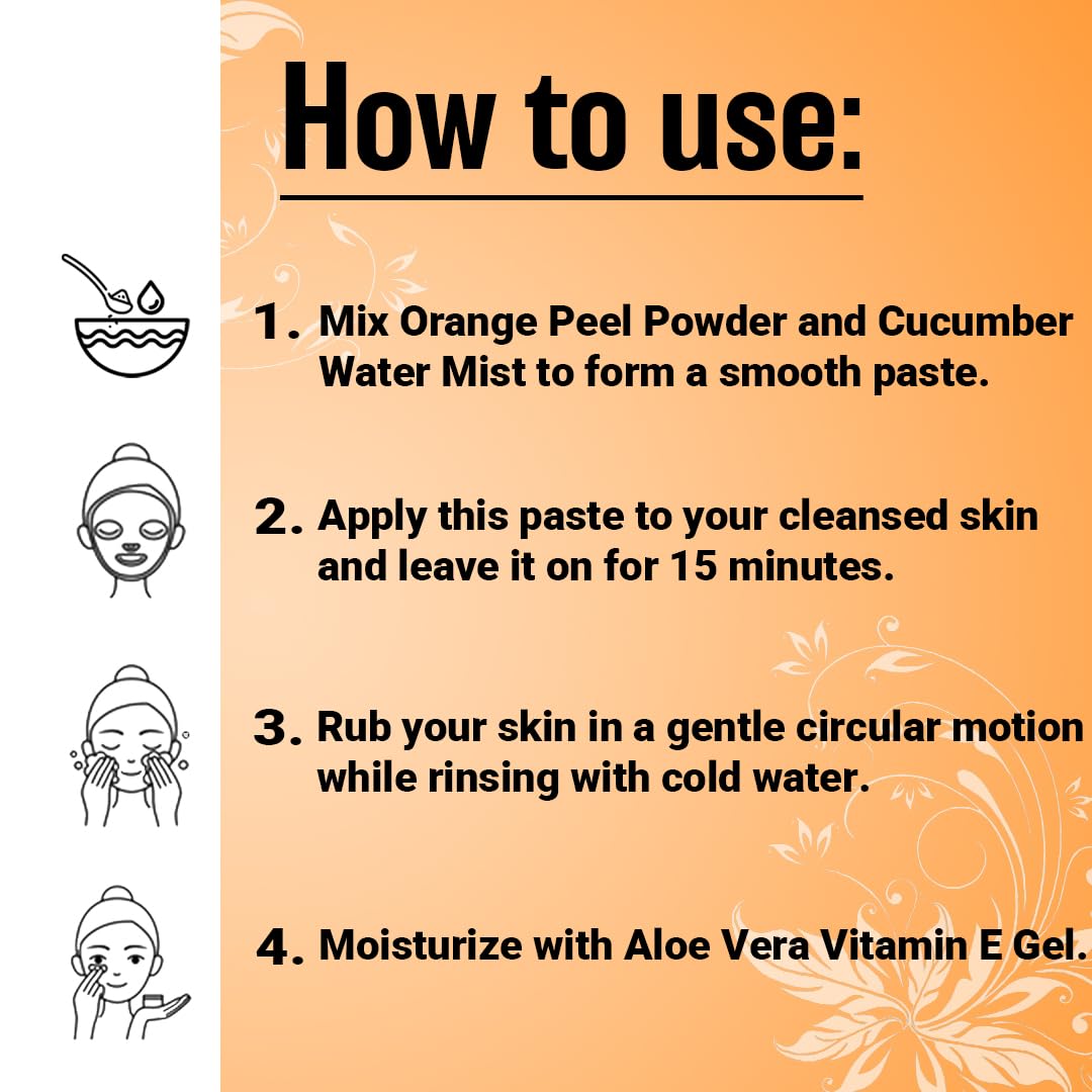 De-tan / Tan Removal Comboâ½Achieve naturally tan-free supple skin with this De-Tan Skin Care Combo! This all-natural kit combines the power of Orange Peel Powder Cucumber Aater and Aloe Vera Gel with Vitamin E Beads to gently exfoliate dead skin cells tan and remove pigmentation.â½Orange peel powder buffs away tan-causing dead skin cells while cucumber water cools down skin for a refreshed feeling. Aloe vera gel with vitamin E beads deeply hydrates leaving your skin feeling soft and supple.â½This gentle and effective combo is suitable for most skin types and can help you achieve more even-toned skin. Enjoy the convenience of creating your own DIY de-tanning face masks at home!How to use De-tan Combo:âMix Orange Peel Powder Aloe Vera Gel with Vitamin E beads and Cucumber Water Mist to form a smooth paste. âApply this paste to your cleansed skin and leave it on for 15 minutes. âScrub your skin in a gentle circular motion while rinsing with cold water. âUse a gentle moisturizer or you can use the Aloe Vera Gel with Vitamin E Beads.