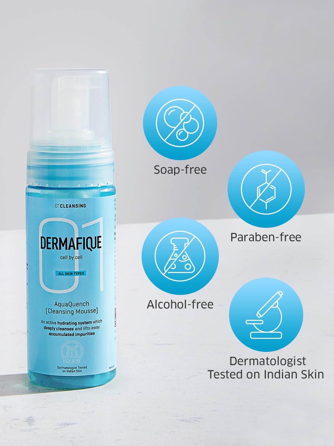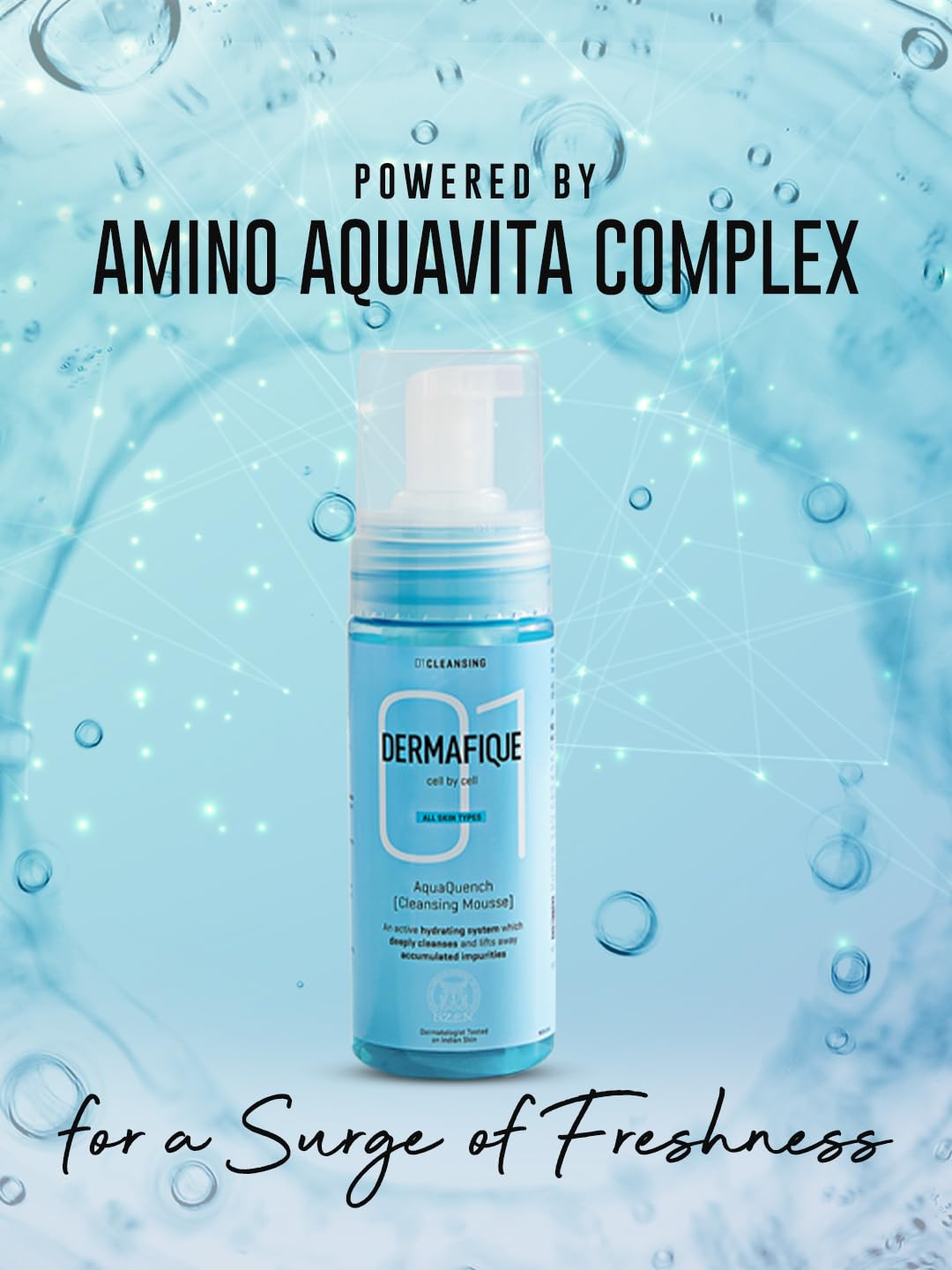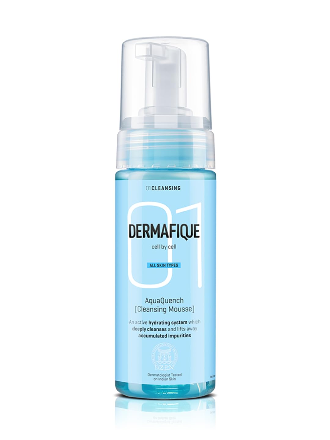 Regardless of whether your skin is prone to dryness due to environmental conditions or genetics choosing the right facial cleanser is an important step to avoid further irritation. s and regular facial cleansers often contain a compound of oil and fat with a strong alkaline solution that can strip your skin of its natural oils. So while these may be effective in cleansing your skin of dirt and grime they o rob precious moisture. The only solution to this problem is finding a -free facial cleanser that multitasks to cleanse and hydrate your skin so that it is not left feeling dry and irritated post-cleansing.The Dermafique AquaQuench [Cleansing Mousse] is enriched with Micro Water droplets and Amino AquaVita Complex to deeply cleanse and lift away accumulated impurities while giving the skin a burst of hydration. This active hydrating system is suitable for all skin types—it balances combination skin hydrates oily skin at the right level and pampers dry skin. Dermafique encourages you to follow the smart new derma-routine : 01 cleanse. 02 tone. 03 hydrate for healthy beautiful zen-like skin. The AquaQuench [Cleansing Mousse] is a vital part of the cleanse portfolio—step 01 of a highly effective system that des cleansed balanced and hydrated skin.