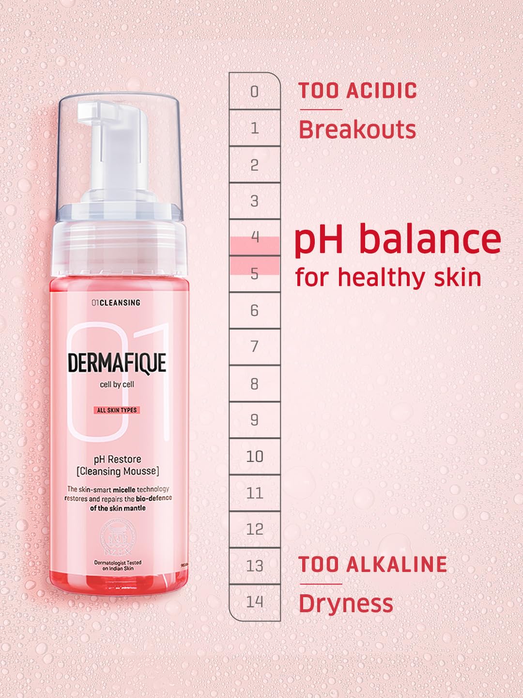 The skin is naturally equipped to fight infection and environmental . However its ability to do so is inenced by its pH level. The pH level of the skin refers to how acidic or alkaline it is. On a scale of 1-14 with 1 being the most acidic to 14 being the most alkaline 7 is considered a neutral reading. The skin consists of a layer on its surface which is known as the acid mantle. This acid mantle acts as a barrier that protects the skin. The acid mantle is made up of sebum (oil) that mixes with sweat amino acids etc to create the skin’s pH which should ideally range between 4.5 to 5.5. When skin is too acidic it results in breakouts whereas when it is too alkaline it results in dryness. As most cleansers are known to disrupt this balance it is imperative to find one that can perform a double duty of cleansing as well as maintaining an optimum pH level. Many factors can interfere with the balance of your skin’s acid mantle as you go about the day. This is why you need a facial cleanser that takes care of your skin’s delicate pH balance. The Dermafique pH Restore (Cleansing Mousse) is powered by Micelle Technology that gently eliminates dirt and grime from the skin while maintaining its pH balance. This cleanser o repairs and restores the skin’s acid mantle. Dermafique encourages you to follow the smart new derma-routine : 01 cleanse. 02 tone. 03 hydrate for healthy beautiful zen-like skin. The pH Restore [Cleansing Mousse] is a vital part of the tone portfolio—step 01 of a highly effective system that des cleansed balanced and hydrated skin.