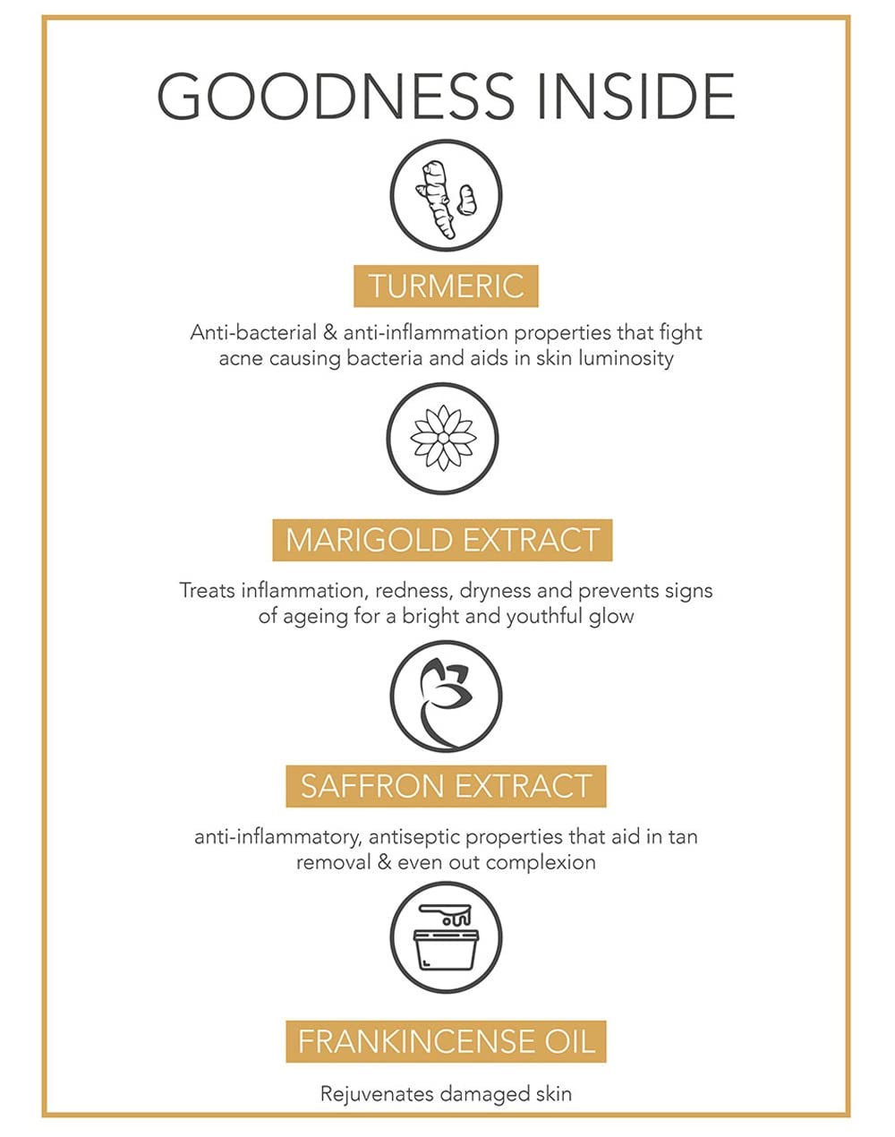 • Marigold & Saffron Extract gently he& soothes the skin working as a powerful antiseptic
